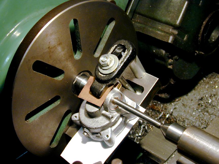 To line up the casting on the camshaft bore, a stub of 1/4" drill rod is center drilled on each end in a collet. The case is slid onto the stub and suspended between centers allowing an angle plate to be bolted to the faceplate using the case face for alignment (with a business card under the case to protect the edge). A single clamp holds everything in place adequately for light cuts (after this shot was taken, a counterbalancing weight was bolted to the other side of the faceplate).