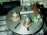 This is a critical operation. The axis for the cam assembly must be located precisely in two dimensions to achieve the correct mesh of the gears. Fortunately, that's not too difficuly. First, the mandrel used earlier is cut down, faced and tapped so it can act as a stub to align the rear case against an angle plate. The plate is squared with the mill axis and an edge-finder used to locate the reference plane for one of the crucial dimensions. The edge-finder is then used against the mandrel stub to establish the axis of the mandrel as the other reference.