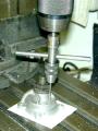 Another screw plug is drilled and tapped in the front face of the front case half (shown being tapped in the photo here with a nice tapping accessory that I don't often get a chance to use due to space limitations under the mill quill). This one is arranged so that with the engine horizontal, it can be removed and oil syringed in until is begins to overflow. The oil level will the be such that the crankshaft counter-weight is just brushing the oil surface. When (if!) the engine is running, the spinning shaft and vibration will fling oil all over the place and a mist will develop that will lubricate everything except the rocker arm pivots.