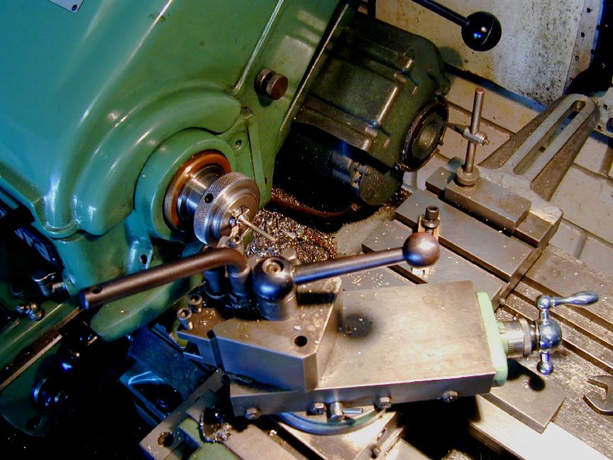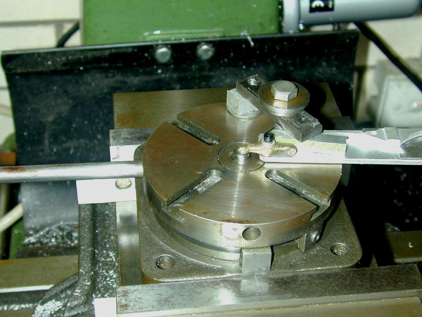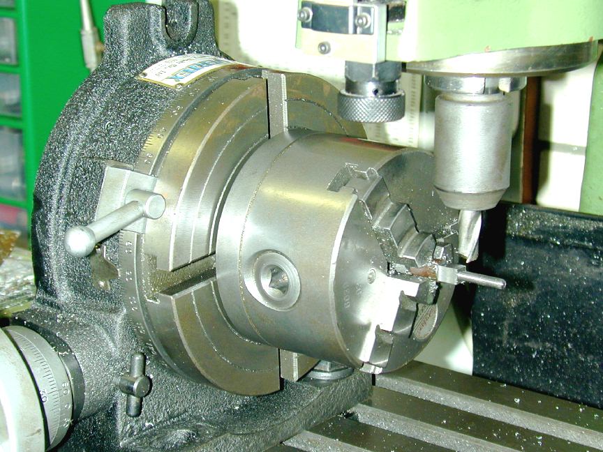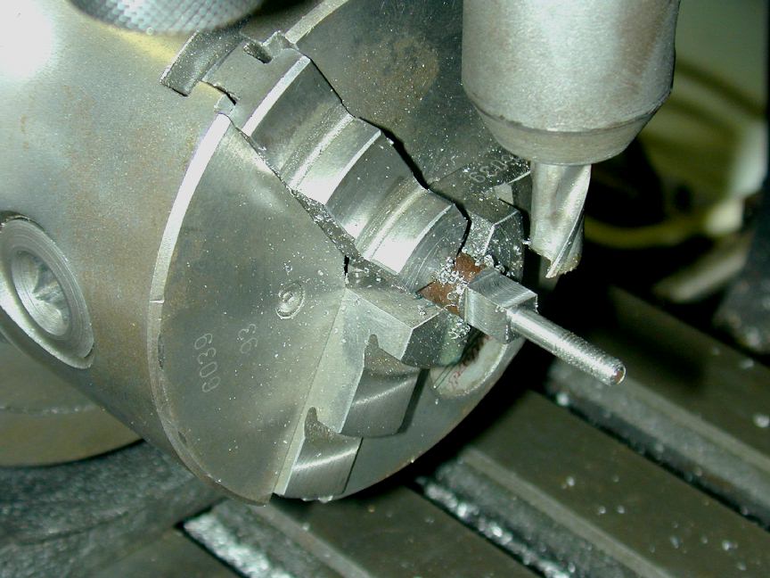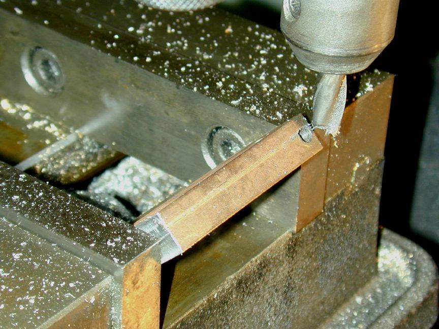 I was (too lazy too lazy that is), and the answer arrives to us by way of the ancient Greeks as the hypotenuse of a right triangle whose other sides are 1/64" long (who needs computers?) Here we see a block of steel from the scrap box, set over at 45 degrees, squared up to the mill axis, getting a V groove milled to a depth of 0.023". Since we are milling down the flank of the V, this is another right triangle with both sides 0.023", so the down-feed required is 0.032". Funny, that's the wire diameter. Wonder if there's a trig relationship I don't know, or have forgotten involved here...