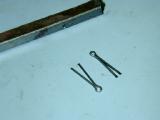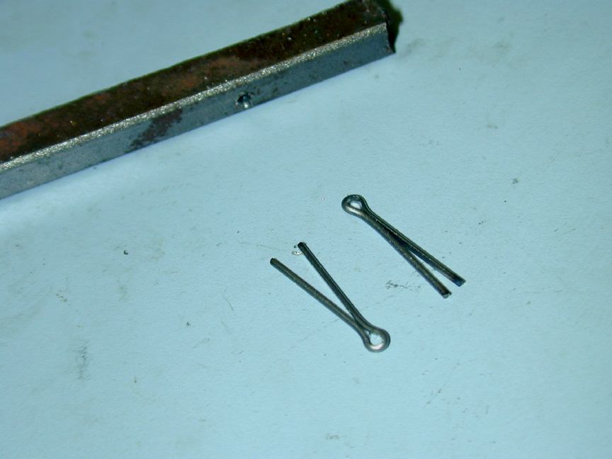 The pins are formed by bending lengths of the wire around a 1/16" mandrel to form a U shape, springing the ends together to poke them into a slightly oversize hole in a scrap steel bar, then, with the mandrel in place, hammering the pin down until it can go no further. When removed, a very neat looking pin results as seen here. I love it when a plan comes together, even if I did break a drill making the hole in the scrap bar!