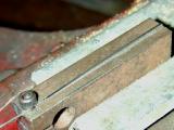 A length of 1/32" music wire is clamped in the block V (by a convenient screw in the case of my scrap box special) and filed down by stroking away from the clamping point until the file contacts the top of the block for the entire length. This provided enough half-round wire to make two pins. The wire could be anealed at this point, but I decided to leave it tempered, just in case this damn thing actually runs.