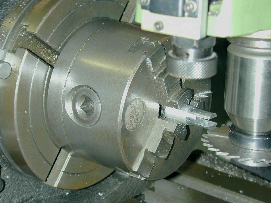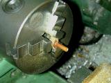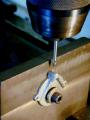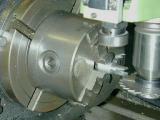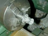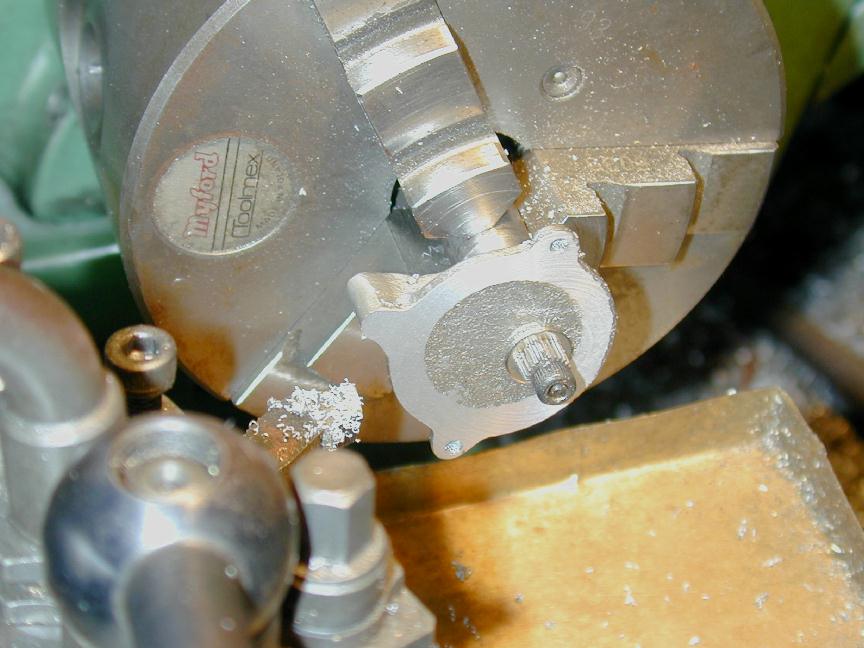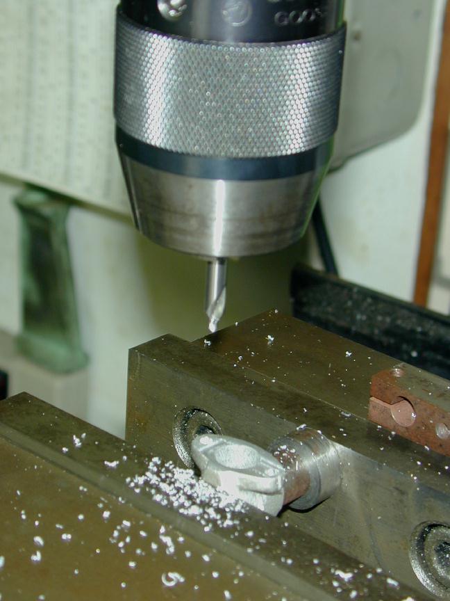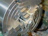 The carb can now be chucked up to drill and counter-bore for the slotted "butterfly". Stupidly, I carefully measured the distance of the counterbore axis from the mounting face as specified by the drawings. I should have centered it in the cast boss, so my bore, as seen here, is just a bit off. Not a lot, but enough to be noticable if you look closely (more grrrr).