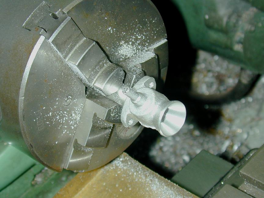 The casting is now mounted on a mandrel turned to be a tight fit in the inlet hole drilled in the previous step. This allows the bell-mouth to be machined. Make sure you machine the opening flat at this step as we need it parallel to the mounting flange for the next setup. Note that the faces of the mounting lugs have also been cleaned up using a ball-nose cutter to provide a flat bearing surface for the mounting screw holes, and to provide sufficient clearance for the screw heads themselves. The little proboscus poking out of the carb body in this photo could have been cut off, and subsequently was. This would have simplified mounting in the previous step.