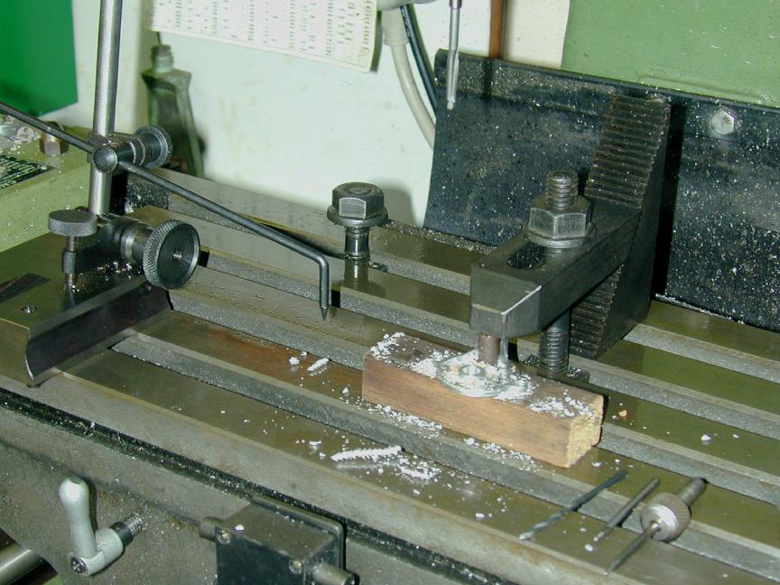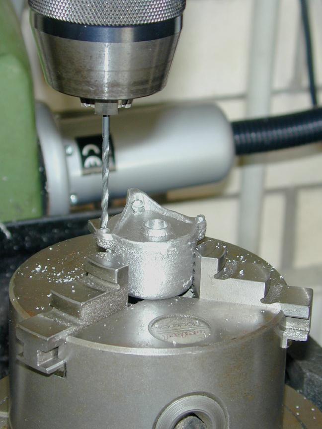 First, the mounting face of the cored carb casting is milled flat, the inlet hole centered and opened out from the raw size, and the two mounting holes drilled to clear 4-40, symetrical with the inlet hole. Clamping up the job is not too tricky as the top of the casting is flat, and a few bits from the scrap box serve to hold it in place and orientation, firmly enough for the light drilling and milling required.
