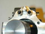 . It stared as a 4-40 screw with the thread turned off to form the jet spray probe. This has been silver soldered into a steel body, forming the seat for a needle that screws into the other end of the steel body with a 2-56 thread. A fuel inlet intersects with the location of the taper of the needle above the seat region. Not shown is the cut-out quadrant on top of the carb body, milled so the brass butterfly choke arm will be restricted between fully open, and almost fully closed. No adjustment for the closed stop is provided.