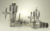 "Elf" engines were produced from the early 30's to the early 50's. At this time, Dan shut shop and went full time into the aerospace industry (he was a trained, professional engineer). During their production life, his multi-cylinder engines evolved from a side port design to reed valve induction. This shot shows the early side port induction twin on the right, with a reed valve 4 on the left. All engines employed sand castings using methods Dan kept secret. |