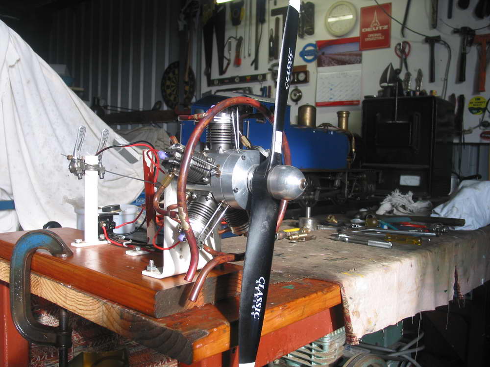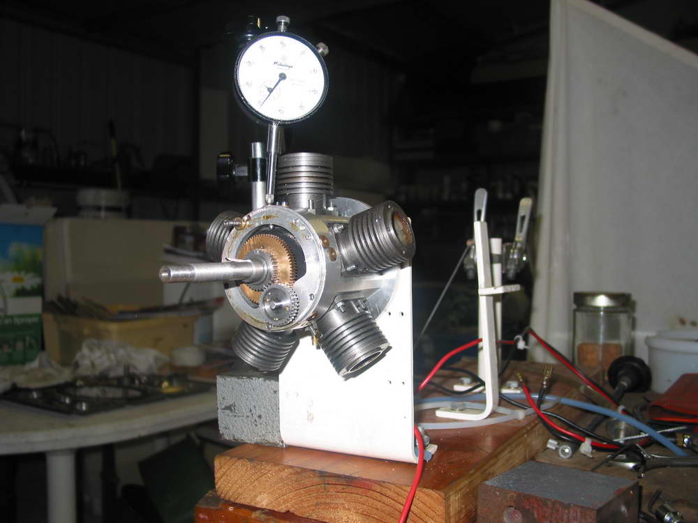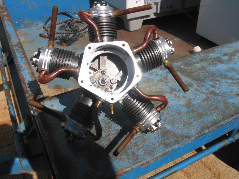 The following is my experience in building a five cylinder, 38cc, four-stroke cycle. radial IC engine. First my background. I was involved with automotive and heavy earthmoving machinery, mainly with engines from 10hp to 1000hp up until my retirement some years ago. During this time I have been interested in models, mainly steam and small IC engines. The opportunity came on retirement so I could pursue this hobby. First I built a 5" gauge steam loco (a "Simplex"), then an 8 cc four-stroke spark ignition engine. These projects sparked my interest in building a radial engine as I wanted to know how they work. The plan was obtained from a friend in UK of a 5 cylinder radial to which I made several modifications, mainly to the induction system and valve rockers. Having a Southbend lathe and a Mill-drill I set about it. The crankshaft was made first, followed by the crankcase, cylinders and cylinder heads. I left the rotary cams to last. They required four internal gears to achieve a ratio of 6:1. As the gears were not obtainable I made two hobs so the gears could be made by the rotating method on the mill. Valves were made from stainless steel and pistons rings from cast iron. Assembling the engine was quite straight forward. Valve timing took some time as the gears and cams are enclosed which meant "assemble and try" several times. Carburetion was from a proprietary make as recommended but caused some problems so I made an air bleed type which worked quite well. As the engine has 5 cylinders it therefore has 5 glow plugs, which require some 15 amps at 1.5 volts to light them up. It took some research to find a suitable 2 volt 20 amp capacity battery that was suitable. With all parts assembled and ready to start the big day came. It is not possible to start the engine by hand, therefore I had to resort to an electric drill which proved satisfactory. Eventually after fiddling with fuel and air mixture the engine fired and performed successfully. KEN DINES, June 27, 2006 |