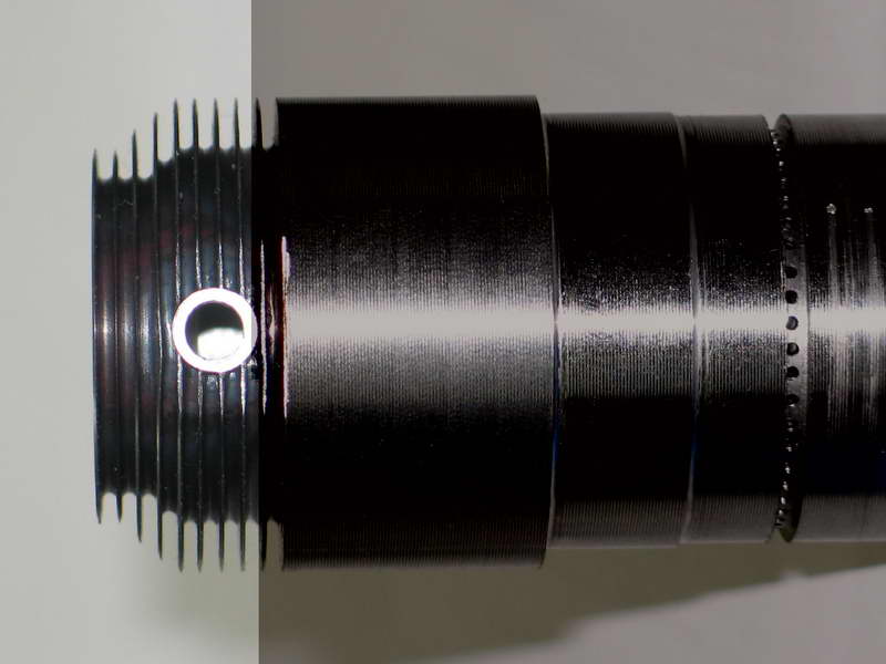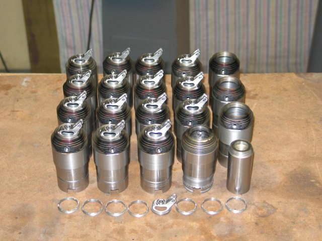 The top photo shows all the cylinders. They are made from 4140 alloy steel. The bar in the front right is the test male thread plug for the internal thread in the top of the cylinder head. All cylinder threads were screw cut to fit the gauge. The photo of the individual cylinder head shows the thinness of the fins, 0.4 mm, which were cut with a special parting tool, and the tapers with a double tool which cuts both sides of the fin at the same time. Note the bottom of the grooves is radiused. The sequence of the machining of the cylinders is critical re holding for the individual machining operations. ie The flat top for the spark plug bush is machined before drilling the hole. The fins are then turned, the spark plug bush is then tig welded in place from the inside. Bit tricky but the welds are perfect. The welding of course hardens the alloy so it cannot be machined afterwards. I write machining procedures for work like this and these are modified to suit when carrying out the work. At present the machining steps on the experimental cylinder are up to 88. The valve cages are cut from solid free cutting steel and it took 2-1/2 hours machining time for each one. There is at least 48 steps. After jigs, methods, and scraped items (about 9) are added, any machining time can be multiplied by a factor of three. I understand Tony Walshaw's statement in the 15/4/77 Model Engineer article, about his 1/5 scale mono, when he said that a number of these ended up in the box under the bench. I have 16 good ones but only require 9 for the front row cylinders, the cages in the rear row are completely different. The base of one the experimental cylinder that I do all the initial work on is finished and it has also has the bore ground to size, 36.66 mm. is shown in the third photo. Drilling the transfer ports (1.25 mm dia) took about an hour on the first cylinder and four drill resharpenings in the milling machine. This was reduced to 11 minutes using a simple dividing head and two drill resharpenings for 882 holes, in my high speed bench drill. |