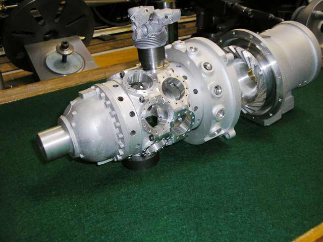This is a sneak peek at a 1/6 scale model of the Pratt & Whitney R-1830 dual-bank, 14 cylinder radial being built by Ron Harris (USA). The lost wax castings are being produced by Bruce Satra (Vernal Engineering, Utah). The center three crankcase sections are machined from solid, as are the blower ring and gear box, blower impeller is a slightly modified from a used Garret turbine. The engine has a bore of 0.875" and a stroke of 24mm, so every camp is satified! The engine will have a scale electrical constant speed, controllable pitch prop. I count 12 tapped stud holes on each cylinder base (168 total). |
