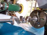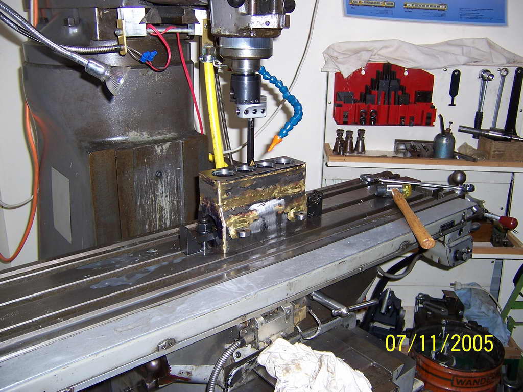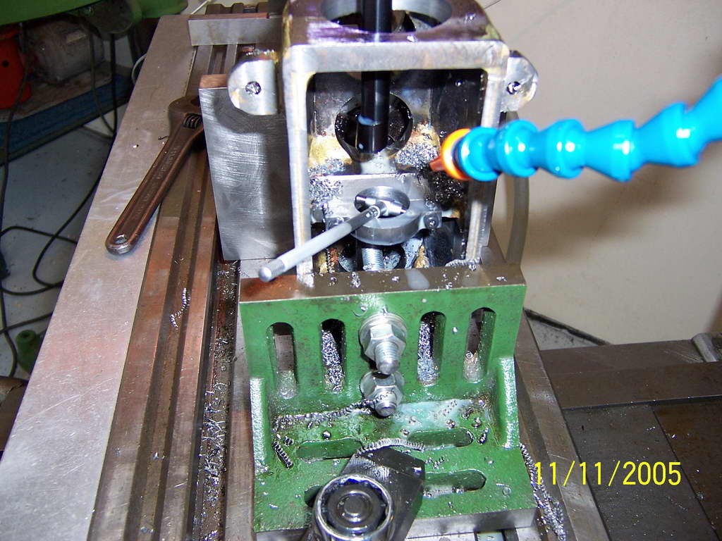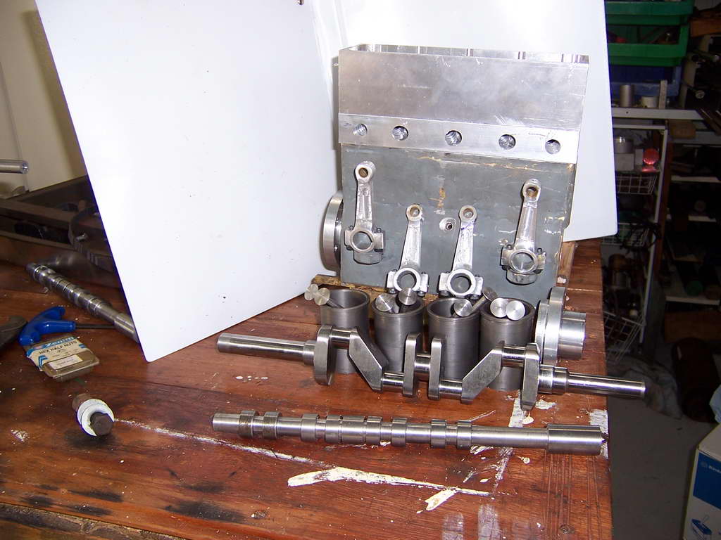 I started building the engine which I have called Walrus (A Sealion on Steroids ) about 14 months ago. I have been a member of QSMEE for 13 years and after building a 7.25" steam loco was looking for a new project. Something different. A "diesel "loco was initially looked at however the thought of useing a single cylinder commercial engine did not appeal. The same project with a multi-cylinder engine would. Roy Amsbury designed a 120cc V8 that was serialized in ME from May '91. It appeared the best bet until one of the club members suggested I look at the designs of ETW as his engines were simple and robust. Sealion was serialized in ME from Jan'59. The volume was available from our club library. It was duly borrowed and copied. Enlarged copies were made of all the drawings and annotated with the enlarged dimensions. At 1.5 times the original the engine is a very useful 100cc plus. Bearing surfaces are generous and I believe I will end up with a useful engine able to run at load for extended periods. The crankshaft was made from 4140 and was, for me an achievement on its own. The block has been fabricated from 10mm and 3mm steel. So far the other components have been machined from solid bar. If I were starting on the cylinder head again I would make it from brass. Mistakes could be much more easily repaired. I am not the first to make an enlarged Sealion. One of my club members gave me a photo copy of Letters to the Editor from ME 7/11/69 in which an F L Davies is proposing to do the same as me. One of the photos I am enclosing is a cam grinding machine I am making. It is following close on the heals of George Punter who published an article on his machine in AME May / June 2003. His concept is great. Mine will just be bigger and uses what I have to hand. This is part of the project I approach with some trepidation. I am sure I will get the hang of it after my first bucket of scrap. |