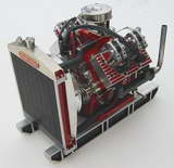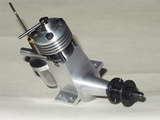 The engine is 1.95 Cu. In. (32cc) in displacement. Cylinders are 90 degrees apart in order to have the engine balanced for vibration free running. The cylinder bore is .875" and the piston stroke is .812". The cylinder banks are not staggered and robust knife and fork connecting rods are used. The multi segment built-up crankshaft and twin cam shafts are amazingly easy to make. A Hall Effect distributor is driven off the end of one of the cam shafts. The distributor body is linked to the throttle arm for spark advance/retard with the throttle setting. The throttle is my proven 2-jet design with an oiled foam air cleaner. Pressure lubrication to the rod ends is by an external gear oil pump which feeds oil through the drilled crankshaft. There is an oil pressure adjuster and an oil pressure gauge port. The engine is water cooled using my unique magnetic drive water pump which has no seals to leak, and a proper looking and effective shop made radiator. The fan blade shroud insures that the 5 curved blade fan actually pulls air through the radiator fins and not just circulate the air around behind the radiator as would otherwise result without one. There are ball bearings on the crankshaft, timing gears, camshaft, distributor, rocker arms, water pump, oil pump and fan shaft. All external parts are sealed using "O" rings which prevent any oil seepage from the engine. A crankcase vent/check valve maintains negative crankcase pressure. A dipstick is provided to monitor the oil level and also an easy to get to oil drain plug. |
