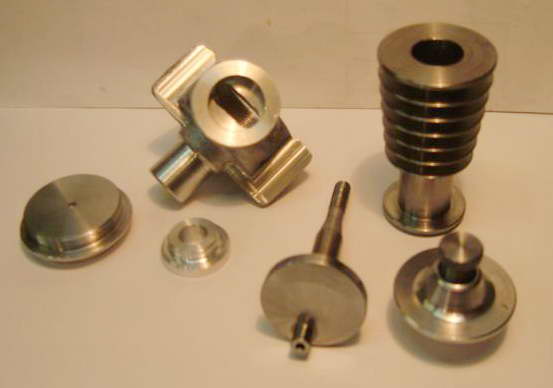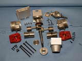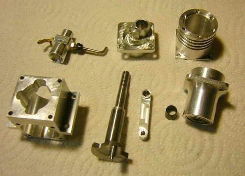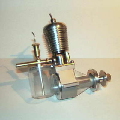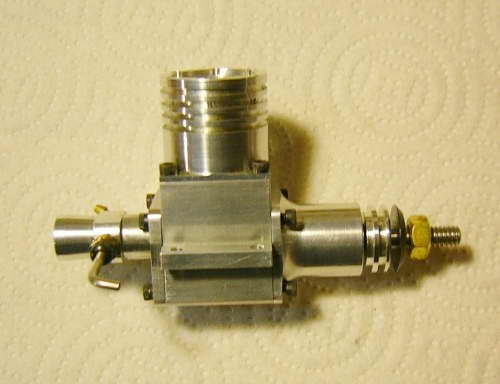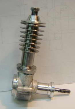 This Sparey 5cc diesel—aka, The Aeromodeller Diesel was built by Australian, Rob Jenkins. Rather than use a casting for the case, Ron hogged it from a solid block of ally. He was going to polish out all the milling marks when I suggested sand blasting instead. The results are just great (in my humble opinion). In fact, you'd be hard pressed in these photos to tell it is not a casting! Rob also side-stepped the problem of aligning fore-aft the cooling fins normally cut on top of the screw-on head; he left them out! Now say what you will about door-knobs, the polished contour has a certain charm... Rob reports it starts easily and runs well, even if initial tests did shake the soft-soldered venturi bits to pieces. |