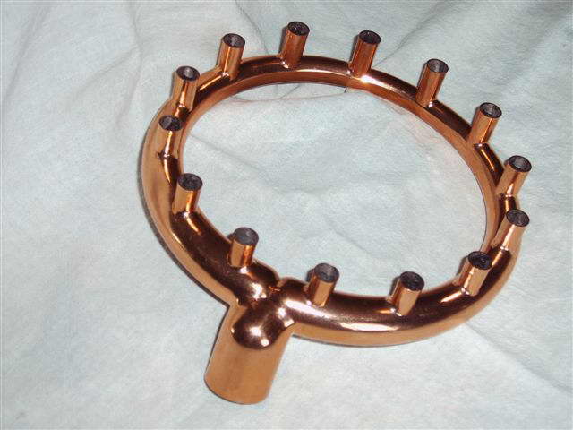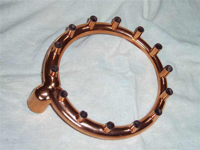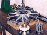 This is an exhaust collector ring for the 1/6 scale model of the Pratt & Whitney R-1830 dual-bank, 14 cylinder radial shown at the top of Page 10 of the Gallery. Before you fall prey to terminal feelings of inadaquecy in the face of the brazing job, take heart: this is no brazing job! The component was formed in one piece by electro-deposition over a plug formed from fixturing alloy (it's ok to feel inadequate over just how perfect that model must have been though).