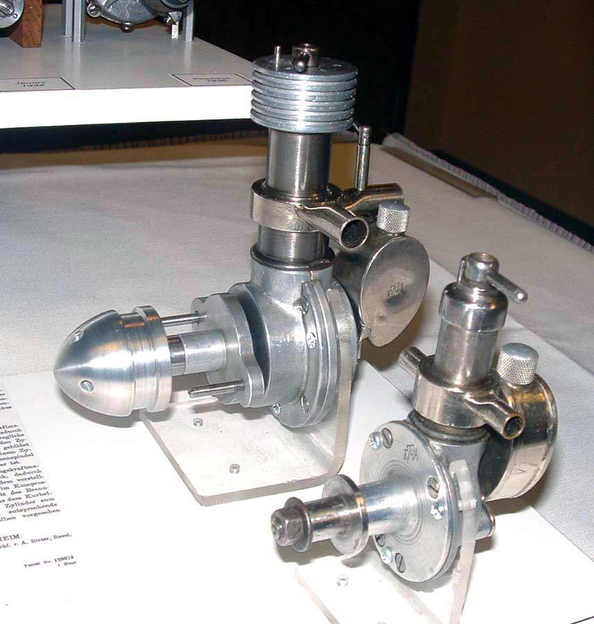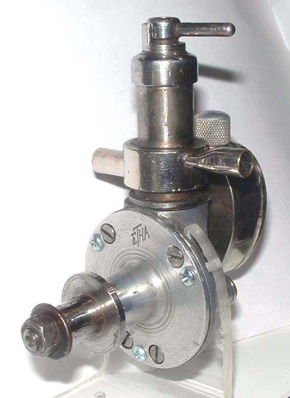 There is some confusion regarding which was the first compression ignition model engine (aka "diesel"). In his book, Collector's Guide to Model Engines, Peter Fisher give the credit to the engine seen here, known as the Etha. Laidlaw-Dickson's Model Diesels gives the credit to the Klemenz-Schnek designed Dyno. Both came from Switzerland in the early 1940's and the general opinion is that the blue ribbon should go to the Etha.
