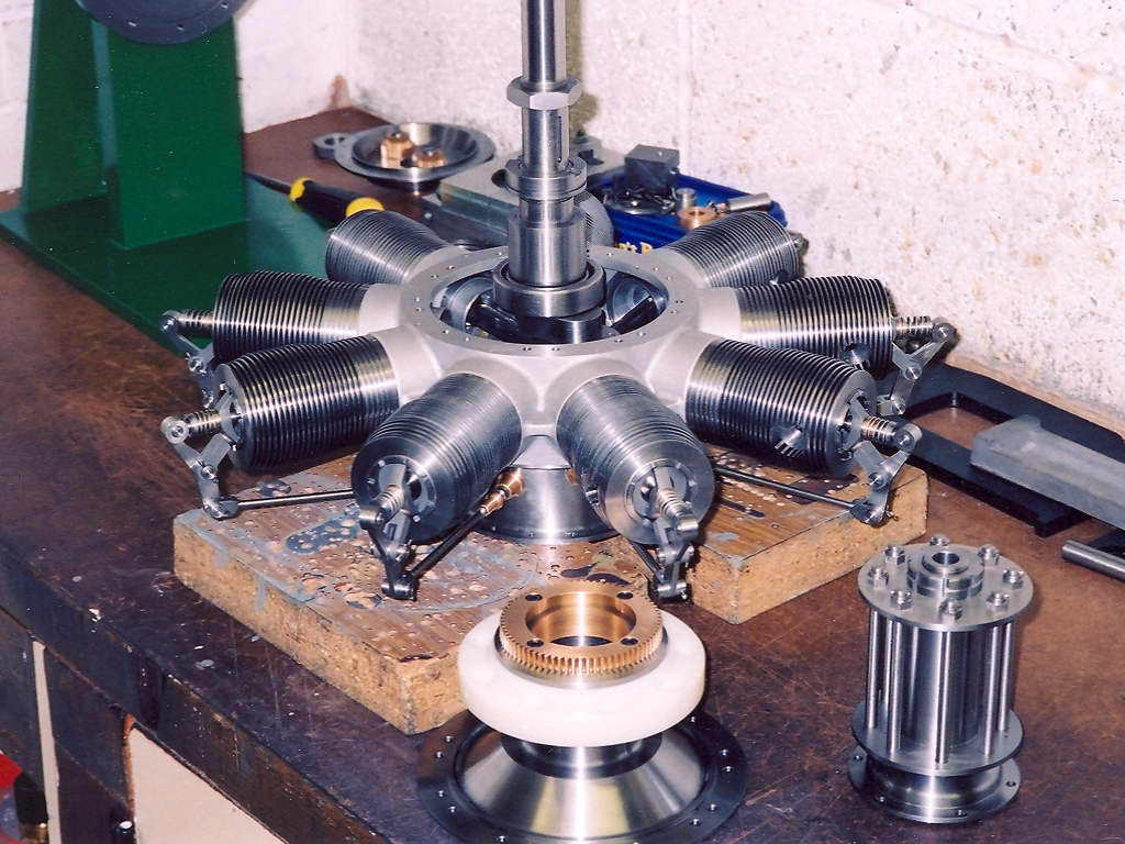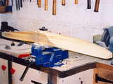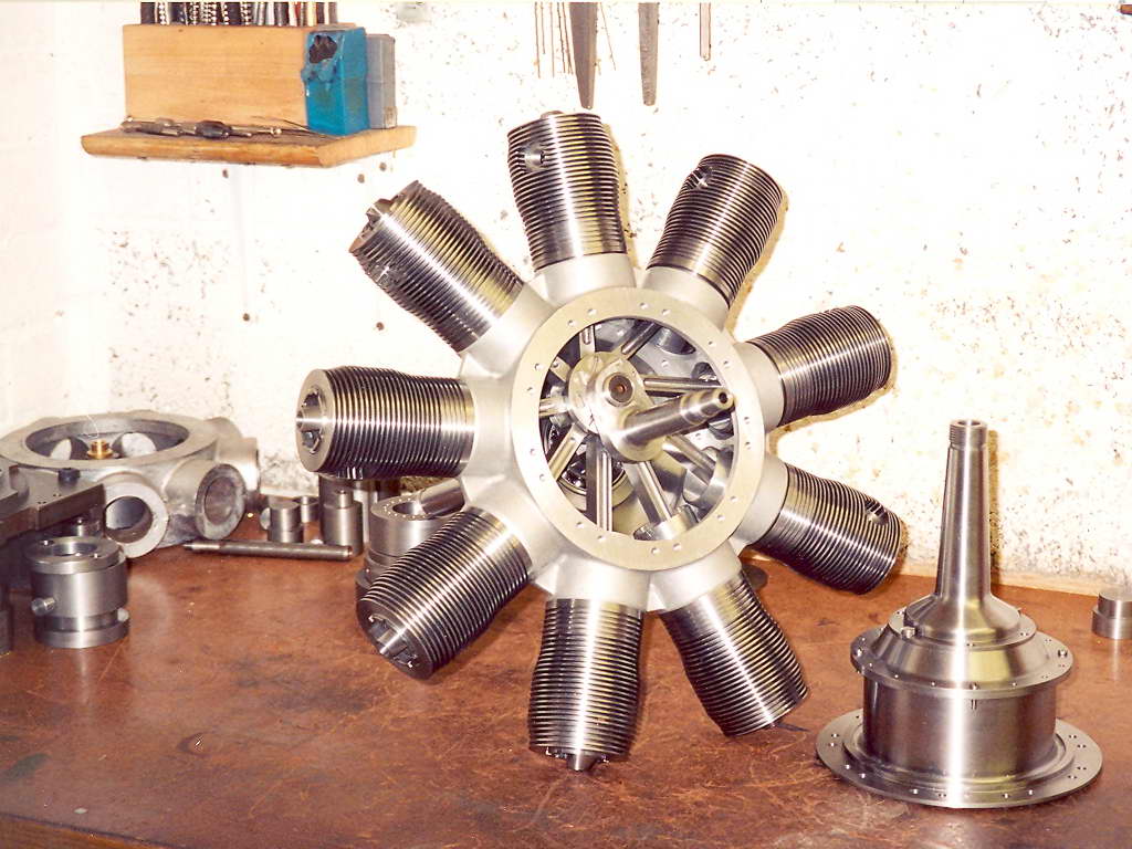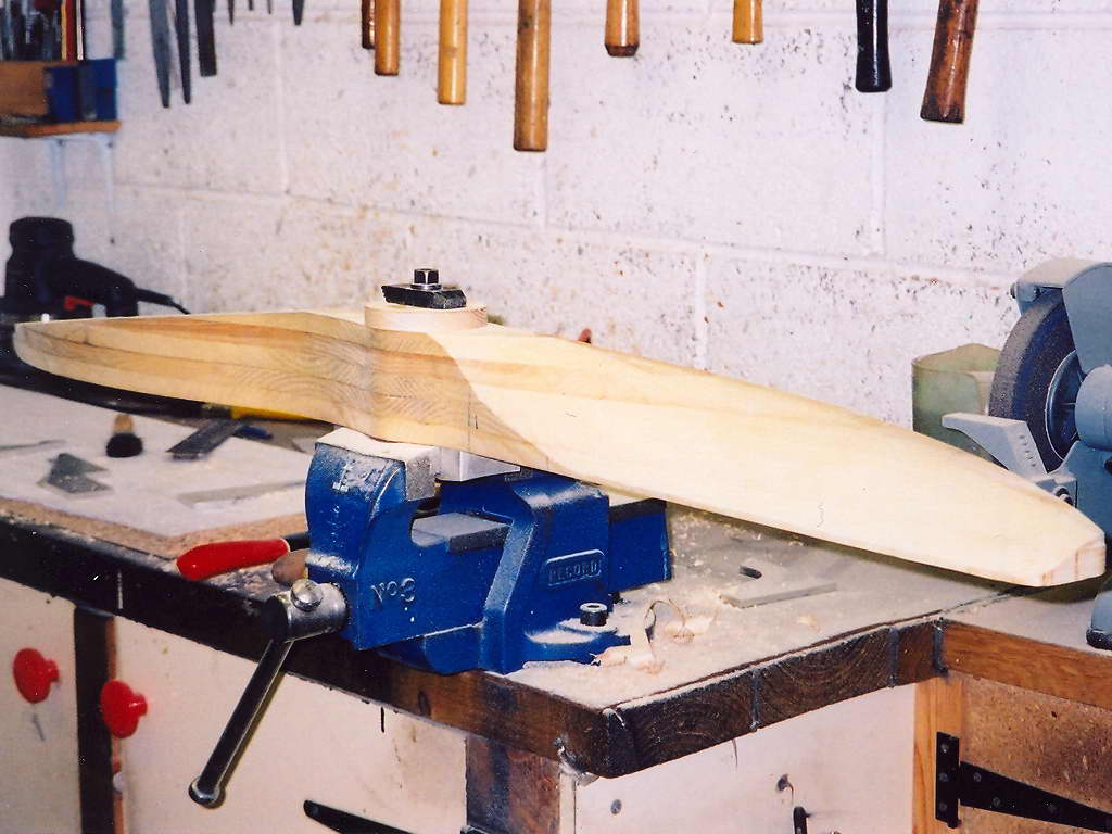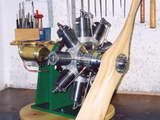 This very fine 40% scale Gnome nine cylinder Monosoupape rotary was built by Jim Winrow in the UK. The result is a very large engine, as can be appreciated by the photo showing the relative size of the 4" Record #3 bench vice holding the laminated propeller blank for carveing. The engine gained a well deserved Best in Class at the 2005 Harrowgate Exhibition.