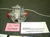 It is the work of North Wales (UK) MEM Member, John Feeney. The engine is his own design Tempest 90 opposed twin, simultaneous firing, twin-cylinder, RRV, Schnurle ported two-stroke. On first glance, I thought John had used ASP or Leo cylinder castings, but not a bit of it! As you can see, the cylinders are lost wax investment castings made to John's design, using dies he also made (the actual casting work is farmed out to a local foundry). This is not a trivial undertaking, but John believes that it is worth it when multiple parts are involved. But wait, as they say, there's more! John also had his liners produced the same way! This is unusual, but not without precedent, being pioneered by ETA for their high performance team race diesel. As you can see from the second photo, John's engine earned a well deserved second place award at the 2007 Midlands Model Engineering Exhibition. The two-throw crankshaft is fabricated—you can see the pressed in crankpins if you look closely. This requires careful jigging during drilling and assembly, but simplifies the conrod big-end and results in the most compact assembly at the expense of maintenance. The cast liners, which appear to have been ground, allow accurate placement of the ports with greatly reduced manufacture time and hence cost (after the die is done). |