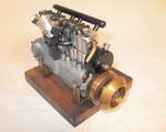 I truely wish I could find where this photograph came from. It shows a water cooled DH Cirrus Mk I obviously made from the 1/6th scale Zimmerman/Dubiel castings. The widget at the front is a water pump driven from a gear cut in the flywheel, and the carburetor has been fitted to feed the inlet first, then dribble down into the crancase for big end lubrication (the opposite to the Zimmerman design which feeds the inlet via the crankcase). |