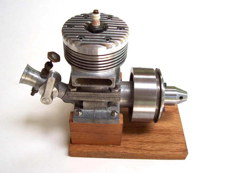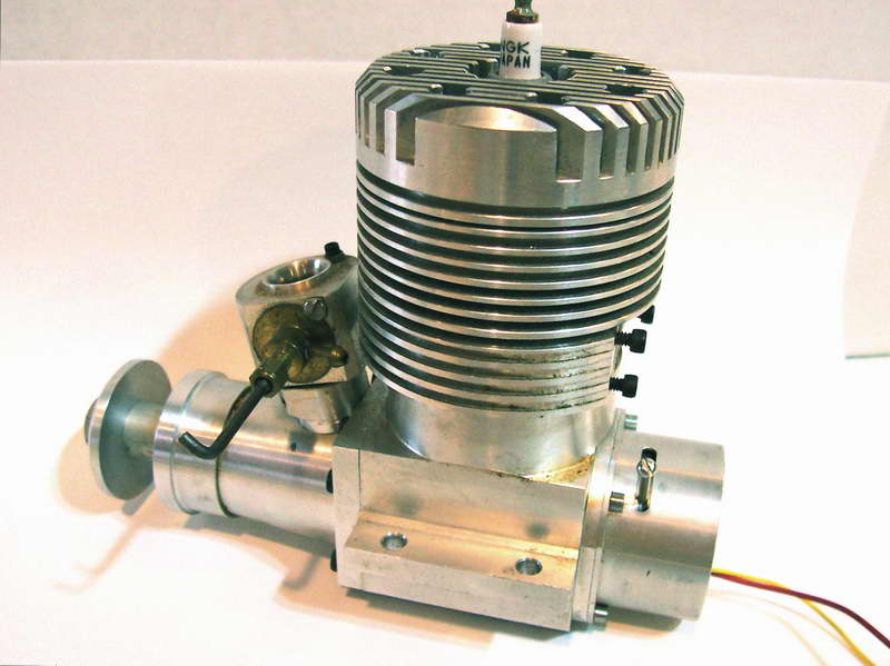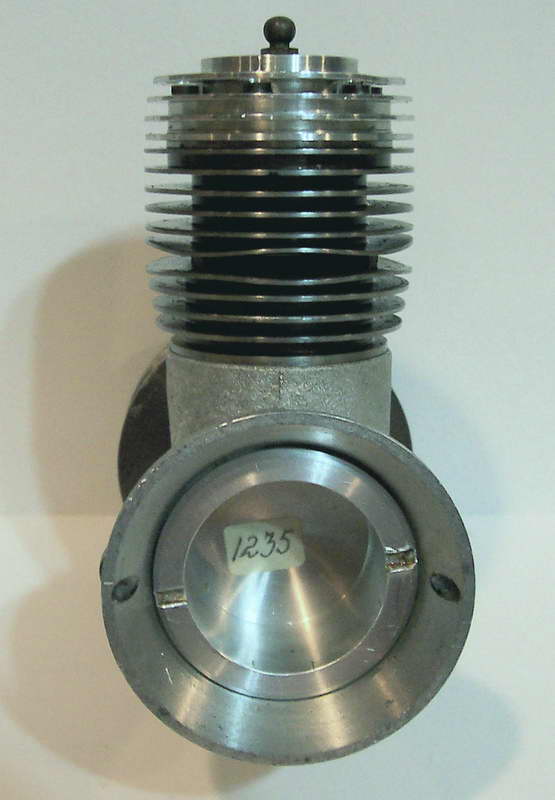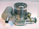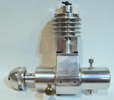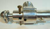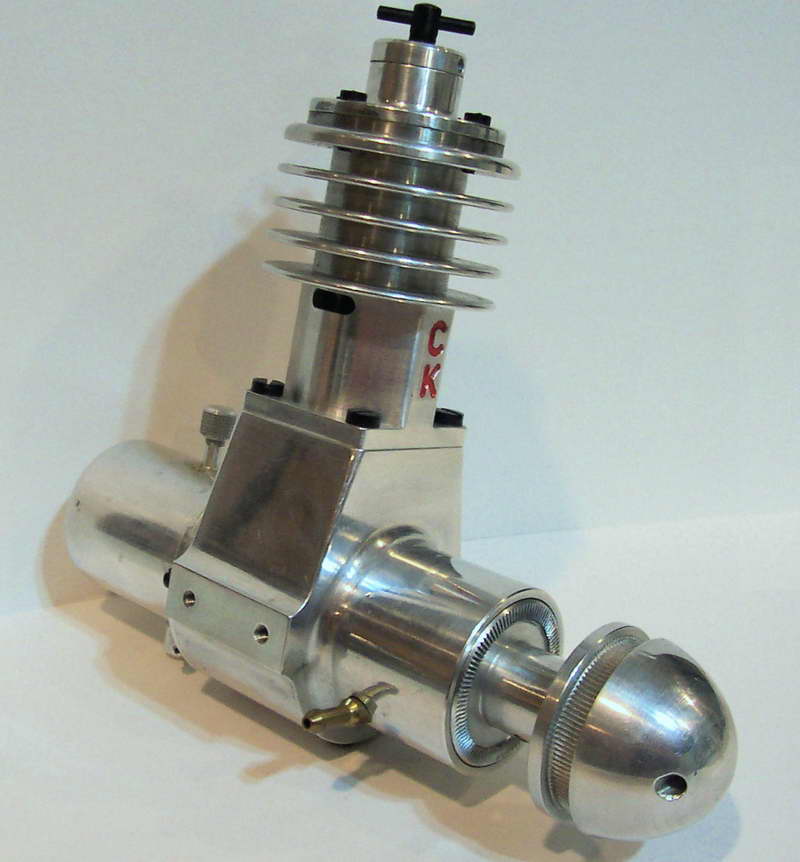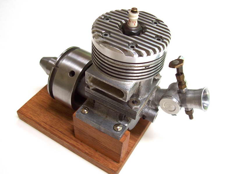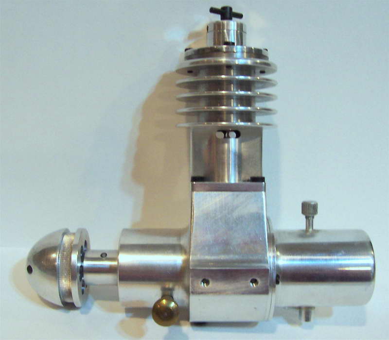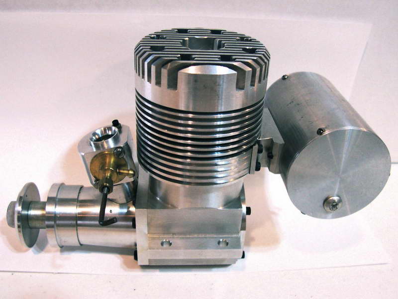 This is a Kemmerling 9.6cc compression ignition engine obtained by Darrel in 1994. The story goes that these engines were made post WWII from top quality aluminum salvaged from the prop hubs of the famous Messerschmitt aircraft, resulting in a strong "Bar Stock" engine with great history. It was designed as an aircraft engine and 2 other sizes are also known to exist: a 5cc and a 3.5 cc all from 1948. Only small production runs have been documented. Note the unusual mounting holes, venturi, and the neat compression screw lock.