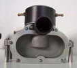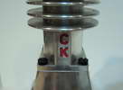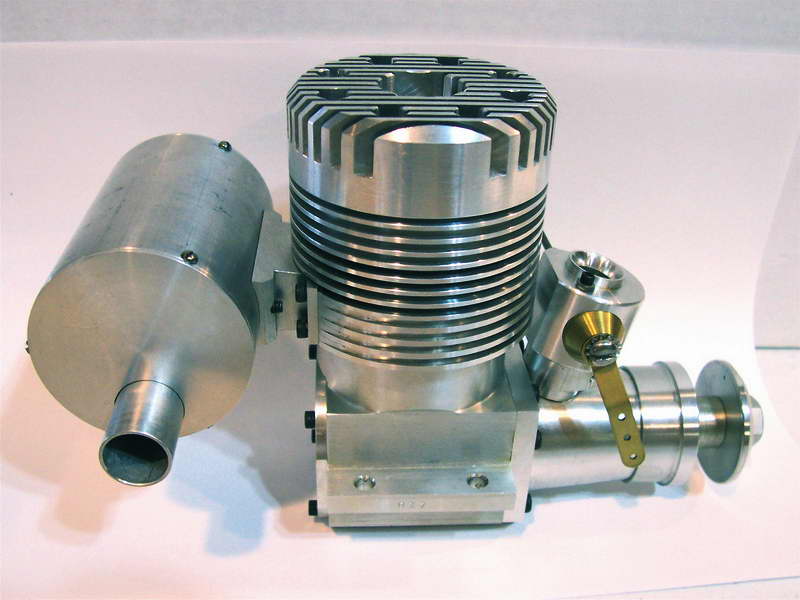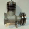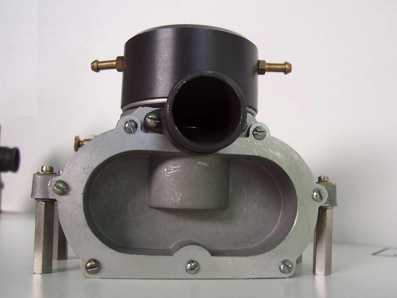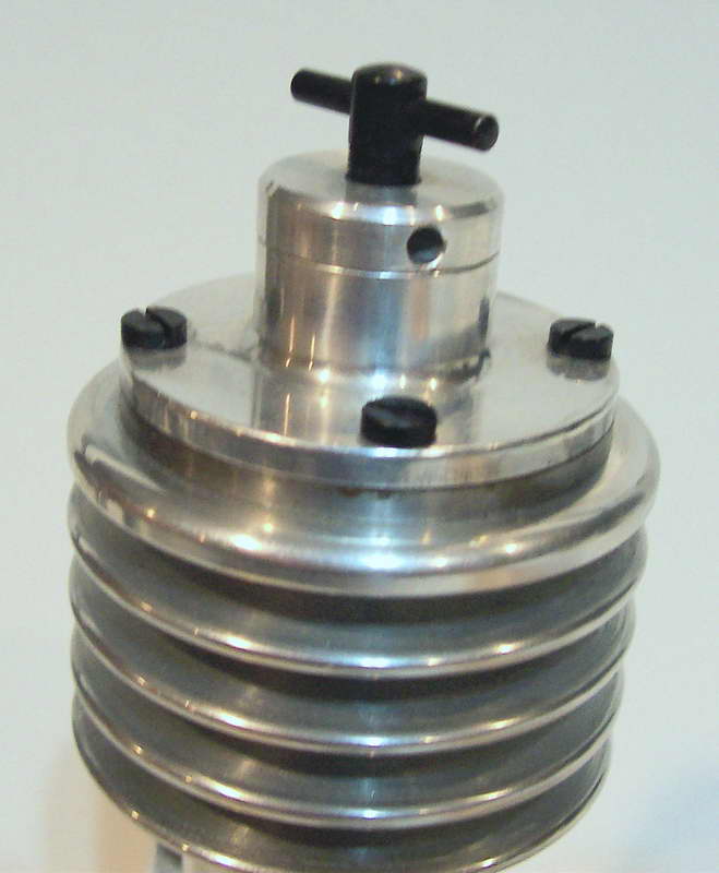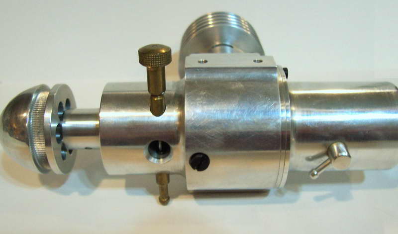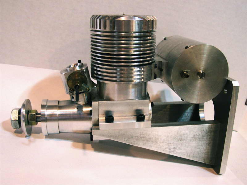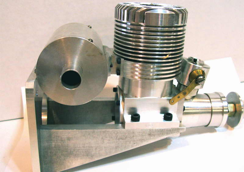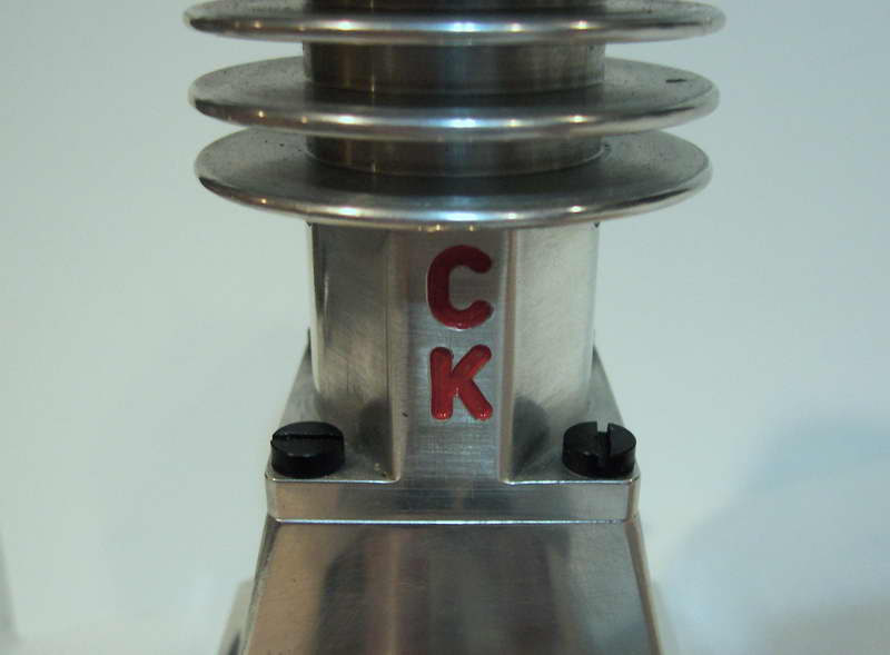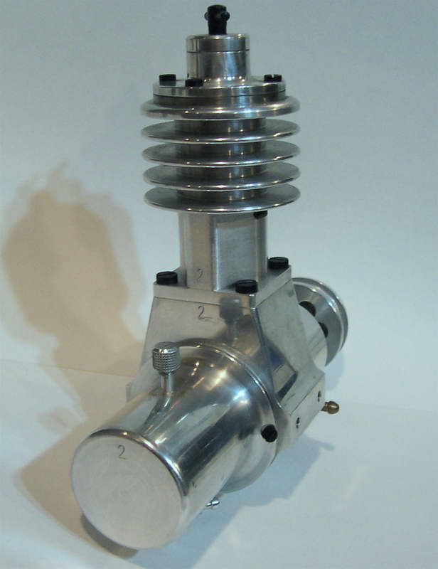 This is a Kemmerling 9.6cc compression ignition engine obtained by Darrel in 1994. The story goes that these engines were made post WWII from top quality aluminum salvaged from the prop hubs of the famous Messerschmitt aircraft, resulting in a strong "Bar Stock" engine with great history. It was designed as an aircraft engine and 2 other sizes are also known to exist: a 5cc and a 3.5 cc all from 1948. Only small production runs have been documented. Note the unusual mounting holes, venturi, and the neat compression screw lock.