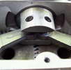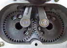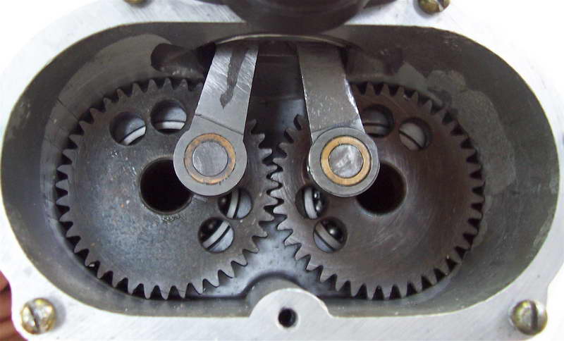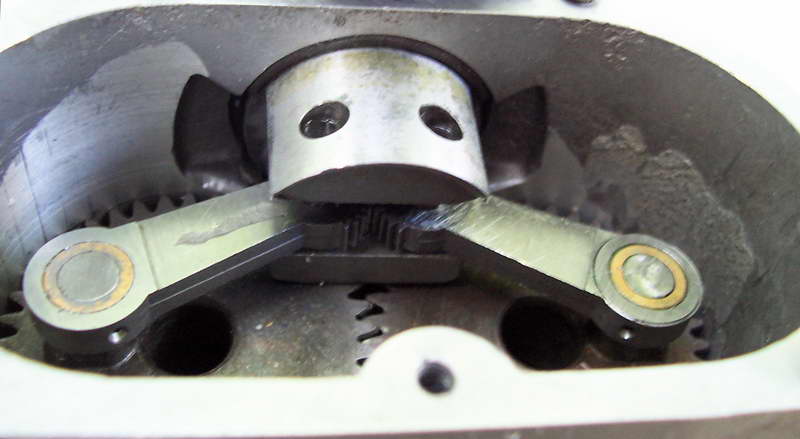 This is a Russian made marine engine with No Name. Only ten were made and all were acquired by Miguel deRancougne for use as "trade items"; Darrel has two. The obvious feature is the geared, contra-rotating crankshafts for contra-rotating water-screws. Using two conrods (with offset wristpins) should balance out piston side forces, giving a slight friction reduction. Less obvious is the way the conrods are themselves geared together at the little-end (look closely at the lower middle shot). Now think of cutting those gears so the parallelogram formed by the four meshed gears precisely matches the pivot locations dictated by the case, cylinder, and piston geometry. By no means impossible, but rather strict precision is required.