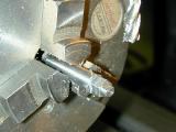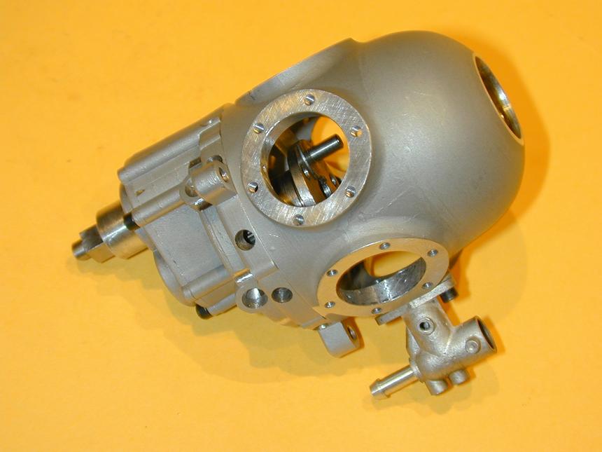The final operation for this stage was to machine the carburator flange flat and drill the inlet and mounting holes. This is located between the #3 and 4 cylinders, directly opposite and under the #1 cylinder, so the position was easy to derive as 9 turns from a cylinder face. It's interesting to note a drawing change here. The Morton drawings I got from Vernal Engineering show a 1/4" inlet bore with mounting holes either side, 1/2" between centers. An earlier drawing (in the set available from ECJ) have the mounting holes 0.563" between centers. I'm guessing the dimension was reduced because the 9/16" spacing placed the holes too close to the carby casting edges. Regretably, I drilled the Morton case to the old drawings before discovering the change. The Satra case is to the new dimension, so my carbys will not be interchangable.