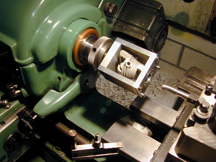 This photo shows the first attempt. All seats were milled flat, but left oversize 5 to 10 thou as measured from the case ID as described above. My plan was to bore all the cylinder holes, then average the readings and mill the seats to deck height by rotating the case with the quill locked at this averaged height. The Heath-Robinson support was cobbled up from clamping kit bits and while it provided support against downward drill loads, the rotating radial load produced a noticible movement of the case. Clearly, a better arrangement was needed.