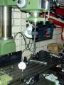 The chuck and crankcase are now moved to the rotary table on the mill to complete the cylinder mountings. But first, I decided it was time to re-swing the mill head as I'd noticed that the large diameter end mill I'd used to face the gearcase had been taking just a wisker off on it's trailing edge when cutting right to left, indicating that the mill head was not perfectly perpendicular to the table. The drill chuck holds parts liberated from a magnetic base used to mount a plunger type DTI so it can be swung through an arc about 18" across. The head is rotated so the DTI reads the same at both sides. Well worth doing more often--damn thing was out by 0.04 in 18". That's only 0.12 of a degree, but significant nevertheless.