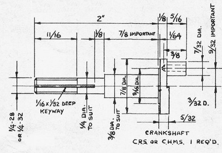- Next, put the shaft blank between centers and turn to drawing, using the sizes found where the drawing says "to suit," remembering to compensate for crankcase error on the 7/8 inch dimension. You can go between size and minus .010 inch if the crankcase is within the limits. Screwcut the 1/4 inch thread and then take a half-thousandth cut, starting 7/32 inch from the crankdisc, right along the 3/8 inch portion, and another half-thousandth cut, 7/32 inch from the shoulder, right along the 1/4 inch portion, including the thread.