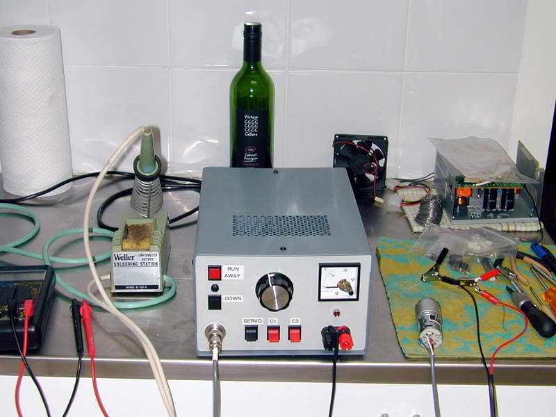Making the generator, including all the panel bashing work, took a whole day of concentrated work (no coffee or lunch breaks). It worked first time and many more minutes were consumed watching it drive the motor in both directions as the pot was turned. The motor is 12 volt, with an integral 100:1 gearbox. The big test was to adjust the pot so the motor was still, then short the generator crocodile clips momentarily, causing the motor to rotate, then stop. Great. Time to admire the work and polish off the lonely Chateau Thames Embankment 2006 that has crept into the background (electronic work being permitted in the kitchen of Number 95).
