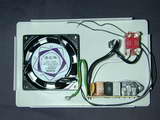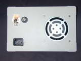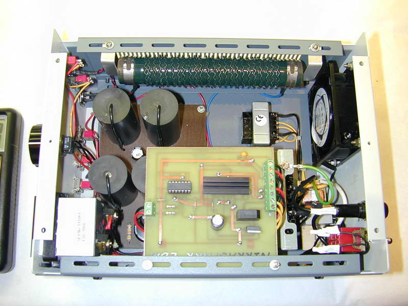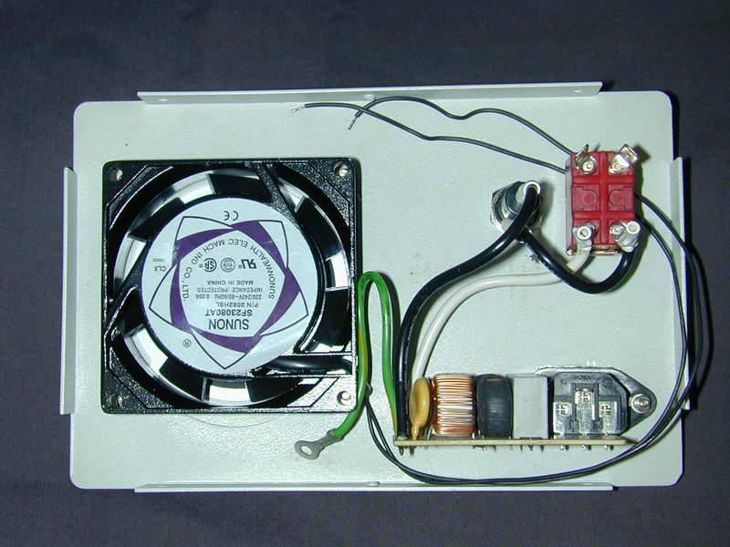 The rear panel carries the on-off power switch and fuse holder. Below them is the AC socket and RFI filter liberated from the dead computer power supply unit (PSU). The cooling fan is placed to suck air into the cabinet and blow direct over the resistor which will be positioned over one of the sets of cabinet vent holes. The arty grid over the fan in the outside view photograph was also liberated from the dead PSU case and sandwiched between fan and fly-cut rear panel opening.
