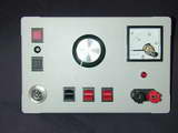 The front panel holds a meter that reads the generator output voltage, a variable resistor ("pot") that provides a reference voltage to the comparator which controls the servo motor driver chip, and some associated switches and connectors. Referring to the front view of the front panel, the momentary contact (push-button) switches in the top left will instantly drive the servo up or down. The red switches at the bottom select additional capacitors for faster but rougher cutting. The black switch enables drive to the servo. A dual color Light emitting diode (LED) between the push buttons indicates servo drive direction. Another single color (red) LED between the meter and spark lead connector terminals at the lower right provides power-on indication. The connector on the left is for the ram servo motor. It only requires two wires, but I've used a four pin connector in case I decide to add a limit switch feature later on. Having used the unit, I'd now say the meter is completely unnecessary, even if it does add a very *pro* look.