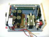 The case bottom carries the two transformers and a panel of insulated board to which the generator DC rectifier, filter and discharge capacitors are fitted. This is NOT a printed circuit. The capacitors are held in place with hot-glue and the underside wired with hook-up wire soldered into loops formed by the component pig-tails. The technical term for this form of construction is a rat's nest, regardless of how neatly it is done.