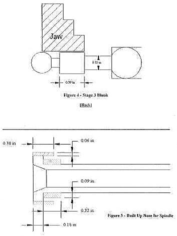 This had me scared for some time and actually caused the project to "go under the bench". When I finally tackled it, it presented no problem at all, apart from machining the actual spindle. Blindly following the instructions, I went out and bought a high tensile bolt, a material which I'd never machined before. This thing cost the planet and I couldn't find one with a head big enough to accommodate the spindle nose. However, looking at it, it seemed that the desired shape could be built up by loctiting on a sleeve which would be under compression when the nut was tightened. These pieces are shown in Figure 5...