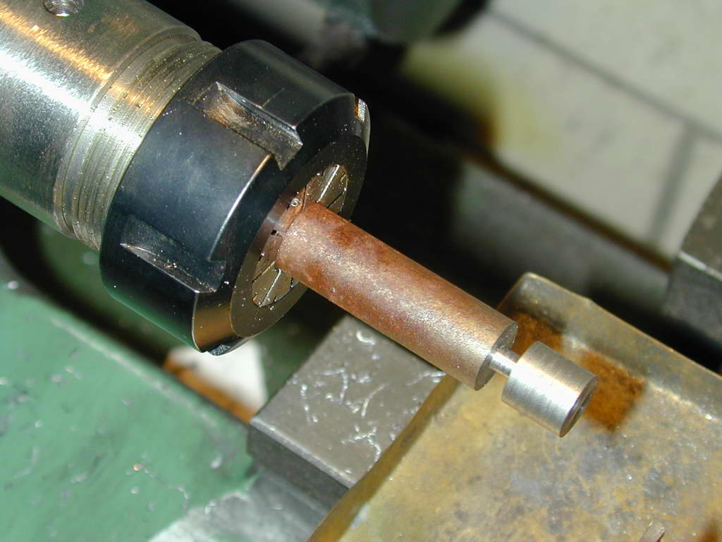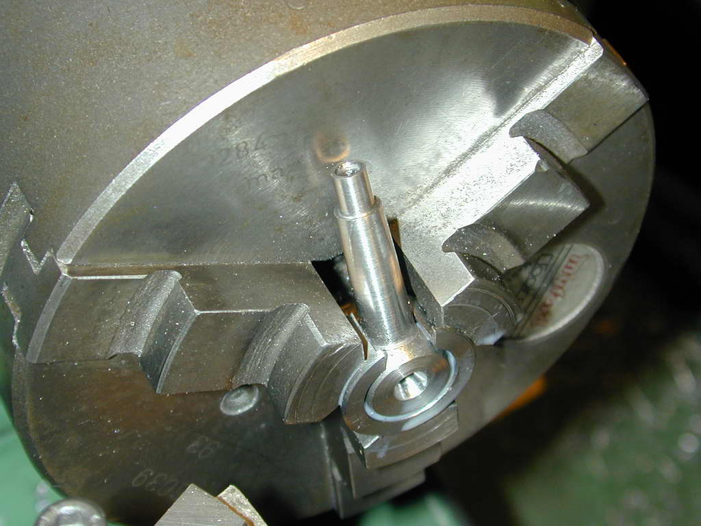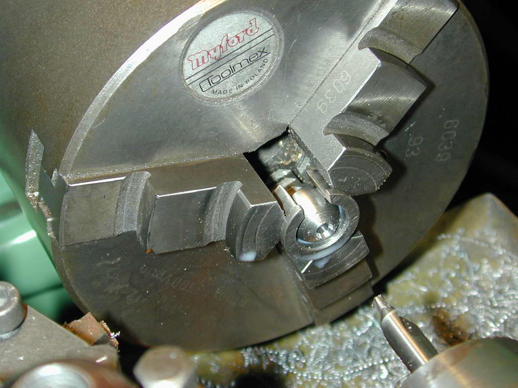 GHT describes how to make little pot-chucks to hold the balls and embryonic ball handles for second ops. Curiously, he never twigged to their use for making the ball handle washer thinning process easy. More on that later. In this photo, a ball has been gripped, faced, and drilled to accept the other part of the handle.