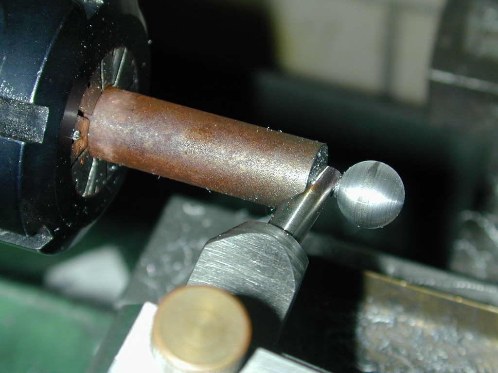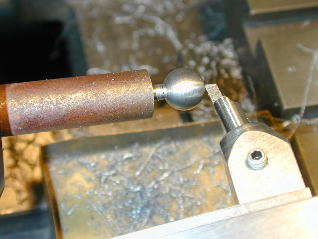 The "up 'n over" (my name) ball turning tool used was designed by Kiwi, Jack Radford. It appeared, naturally, in the Model Engineer, and in the book of Radford's collected tools [1]. A kit of parts with plans and instructions for a slightly modified version can be bought from Hemingway in the UK, which is where mine came from. The tool is basically a pivoted, tangential cutter. It does a beautiful job, especially in leaded steel like 12L14. But for the little balls which are 7/16" in diameter, all I had was some very ugly mild steel stock that almost defies a good finish. The tangential cutter does a remarkable job on the hideous stuff making me think I should change over to tangential cutters for everything!