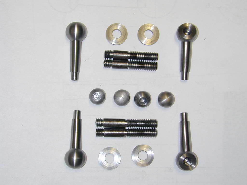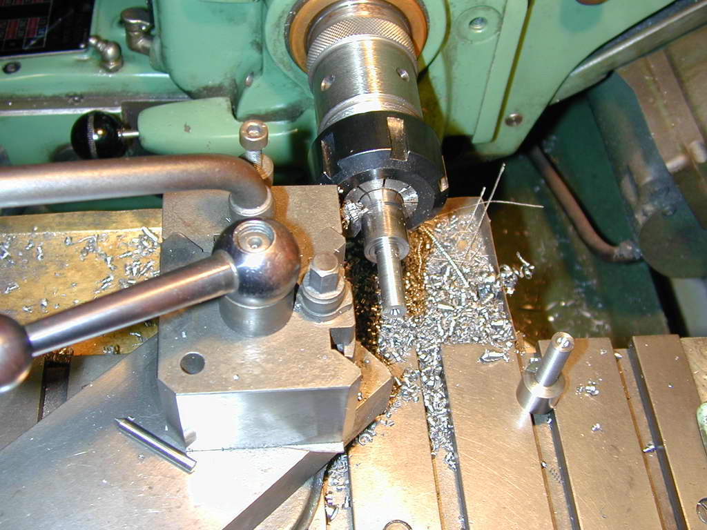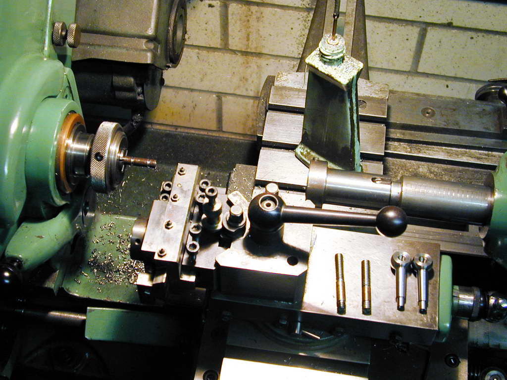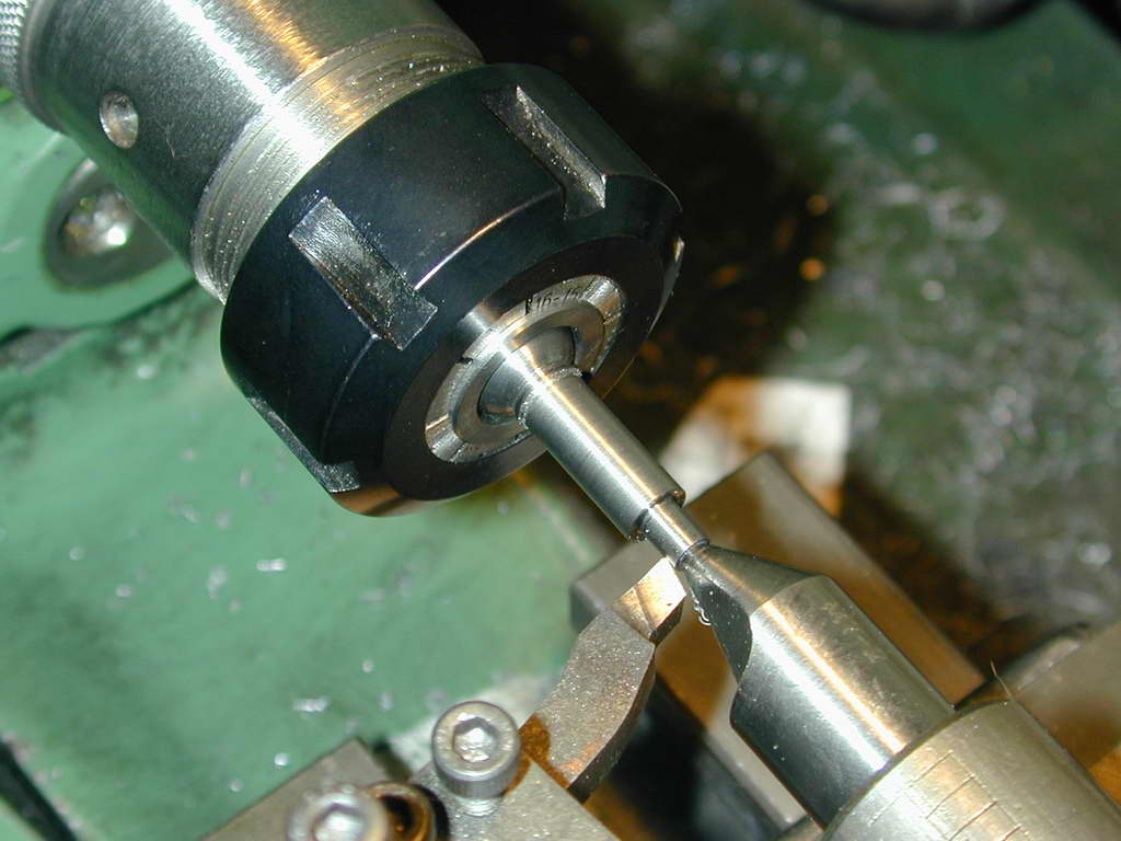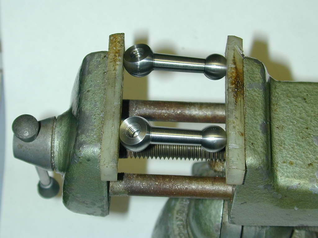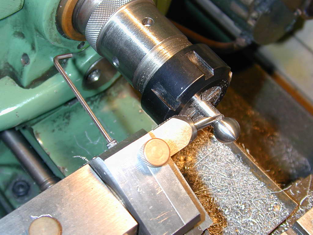 The "big end" balls are production-lined in a similar way to the little ones, except this time, the blanks have the shank turned down to a couple of thou larger than the major diameter of the tapered shank. In this shot, a blank is being parted off. You can see a finished one on the saddle. Note the center that has been drilled in the end of the blank. This is vital. If you forget it and turn the ball, you've just made attractive scrap!