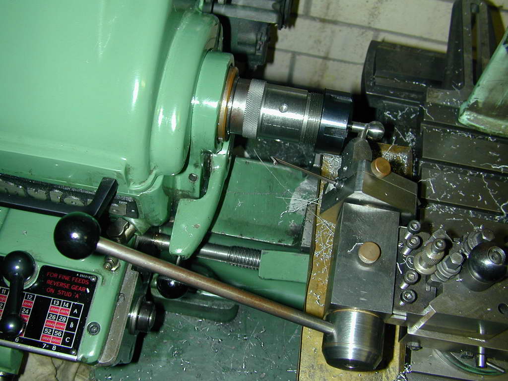The last parts to make are the studs for the cotters and the washers. The plans call out the thread as 1/4" BSF (British Standard Fine: 24 TPI). Since I have a good stock of UNC 1/4-20 cap head screws, that's what I used as temporary clamps for the cotters when boring the arms. A 60° 20TPI thread is 1/32" deep. I would not try to run a 1/4" die down a piece of rod and expect the thread to be of acceptable quality. In photo 44, the thread is being roughed down to provide a start for the tail-stock mounted, adjustable die. Photo 45 shows the manual mandrel handle used to finish the thread with the die.