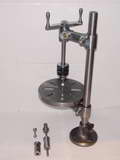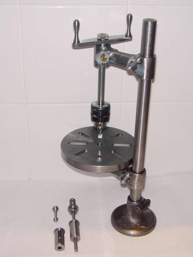 The concept is simple. A sturdy 7/8" diameter, precision ground, mild steel pillar is mounted in a cast iron base. The pillar carries two cast iron arms bored so that 3/4" diameter objects placed in their outer holes will be perfectly parallel. This allows tables and other widgets to be fitted to the lower arm so that their surface will be at right angles to shafts held by bushes in the upper arm. This geometry facilitates tapping, riveting, stamping, drilling, etc. If made correctly, when the two arms are brought into line, their tool holding bores will be concentric. This permits "staking" and light punching operations to be carried out. By engraving the perimeter of the table in degrees and fitting a pointer, the table can act as a divider where accuracy of less than gear-tooth precision will suffice.