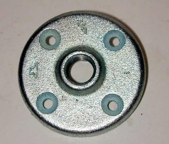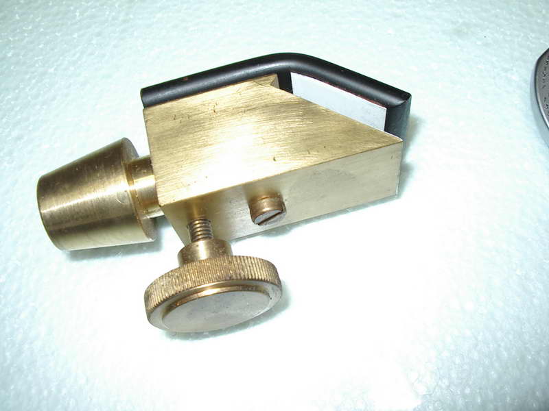 Now to the bases. The device needs a nice, heavy base so it stays put while in use and provides adequate tip-over prevention for the expensive, delicate instrument. For me, the base for the GHT UPT seemed an ideal solution, so a plug that the clamp screws into was turned to fit the UPT base. Roger just visited his local Home Depot and found a suitable cast flange, complete with a screw-in plug! I just love this lateral thinking. If I had not had the UPT base handy, I'd probably have wasted time and money turning one from brass, or cast iron.