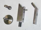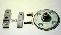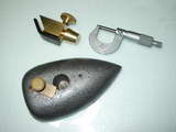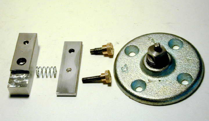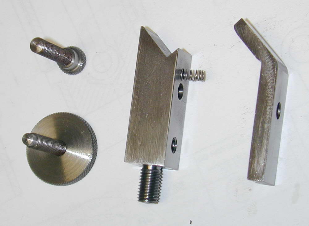 Ian Bradley, or perhaps Norman Fellows, adapted the concept used by a product from the instrument maker, Starrett, as the commercial item had become unavailable. The clamp is based on the concept of the "engineers' clamp" that uses two screws to ensure parallel closure of the jaws. The angle of the head on the Starrett job could be adjusted, but the DUPLEX team decided that 45° was a good angle for reading, and sensibly omitted the angle adjustor. The photo shows the components. The small knurled screw adjusts the jaw gap so that a light turn of the large knob closes the jaws accurately on the frame of the micrometer. The spring opens the jaws when screw pressure is relaxed. Positioning the knobs at the rear gets them out of the way, although this is not critical.