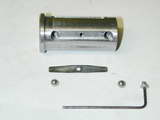 The stamp holder is designed for the common and inexpensive Asian import stamps. These are available in a variety of heights. The ones generally used for tools and model engine serial numbers will be 1/16", 3/32" and perhaps 1/8" in height. All have a shank size nominally 1/4" square. The holder comprises a bush with a square hole centered in it that is 0.01" larger than the stamp shank size. Two spring loaded pairs of ball bearings are arranged on orthogonal faces. This assures that all stamps are forced to slide against two opposing sides. The pressure of the balls also provides friction that so that a punch will stay wherever it is put, but slide freely. As can be seen in the photo, the holes for the balls are not drilled through at ball clearance size. The flat spring pushes the balls against the seat so that they protrude about 0.025" into the square hole. That square hole is created by milling a slot in the round stock, than making a close fitting filler piece that is clamped in place on a 0.260" packing piece while it and the holder are cross drilled for drill rod dowels that retain the filler piece. Simple, right?