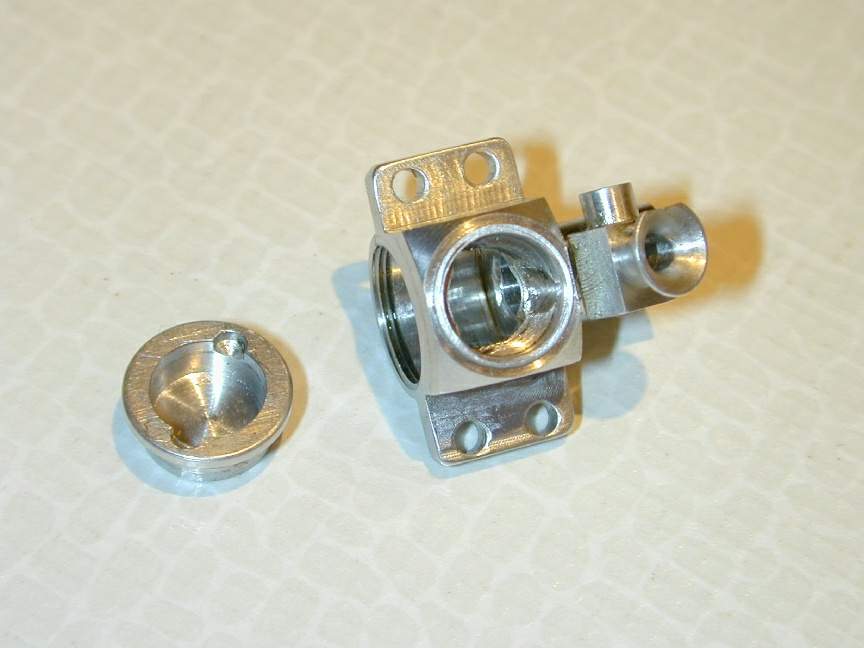 As mentioned previously, the crankcase is formed from a cube of aluminum. The venturi is machined separately and secured with Lok-Tite before the final reaming of the crankshaft journal. Notice the three transfer passages in the photo. These terminate in a transfer belt below the cylinder seat that matches with the cylinder transfer ports. If you look very closly, you'll also see the stuff-up that turned away part of the venturi opening. Always happens on the last operation!