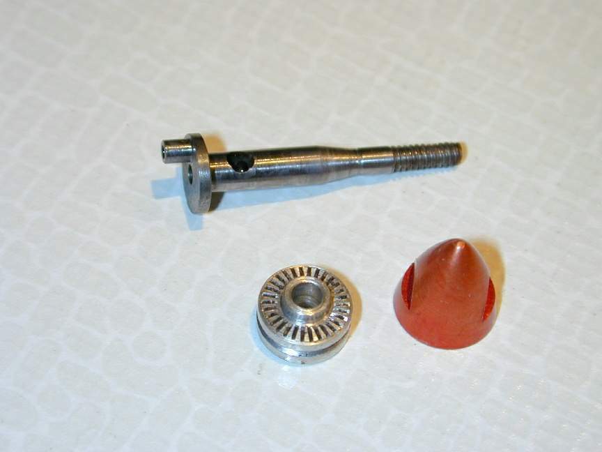 There's nothing special in the crankshaft components. Another jig (not shown) is made to hold the shaft in the 3 jaw chuck, offset by half the throw for forming the crank pin. Even at these sizes, final lapping to size is no different from larger engines in terms of the amount of metal that must be LEFT for removal. Only the microscopic size makes things difficult. The prop driver knurls were formed with a thread form tool, set on edge and used as a shaper. The prop nut is anodized in the usual way.