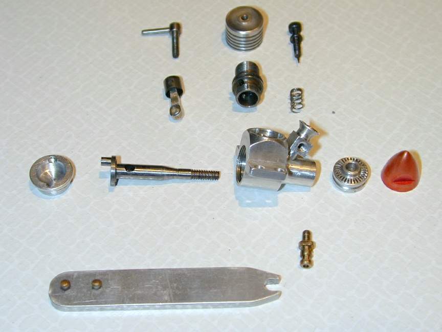 Here is an exploded view of the engine. The odd looking thing in the foreground is a special Nano-Spanner required to tighten the backplate. It also fits the fuel nipple. The construction is extremely conventional - only the scale is unusual.