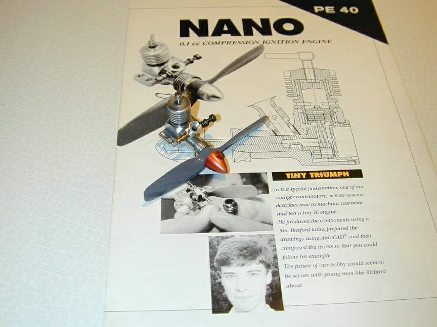 The Nano is a 0.1cc (that's less than 0.01 cuin) compression ignition engine - most frequently, if somewhat inaccurately, referred to as a "diesel". It was designed by Richard Gordon and the plans were inluded as a supplement with the British Magazine Model Engineer in the early 1990's. The plan reprint is still available from Nexus in the UK (Quote plan PE40).