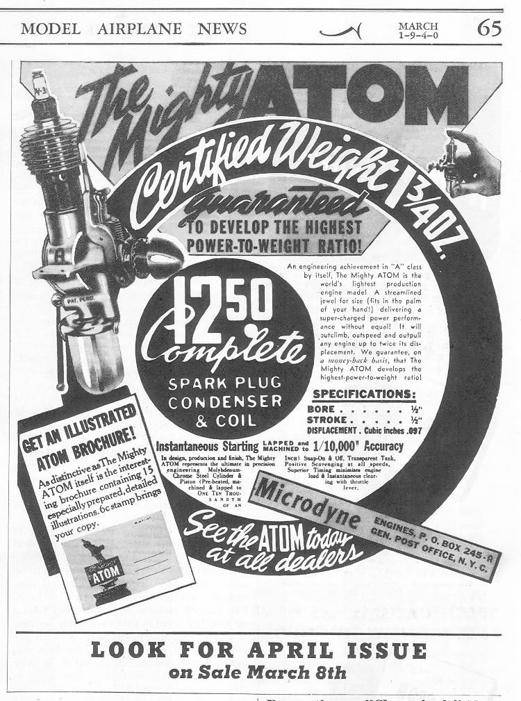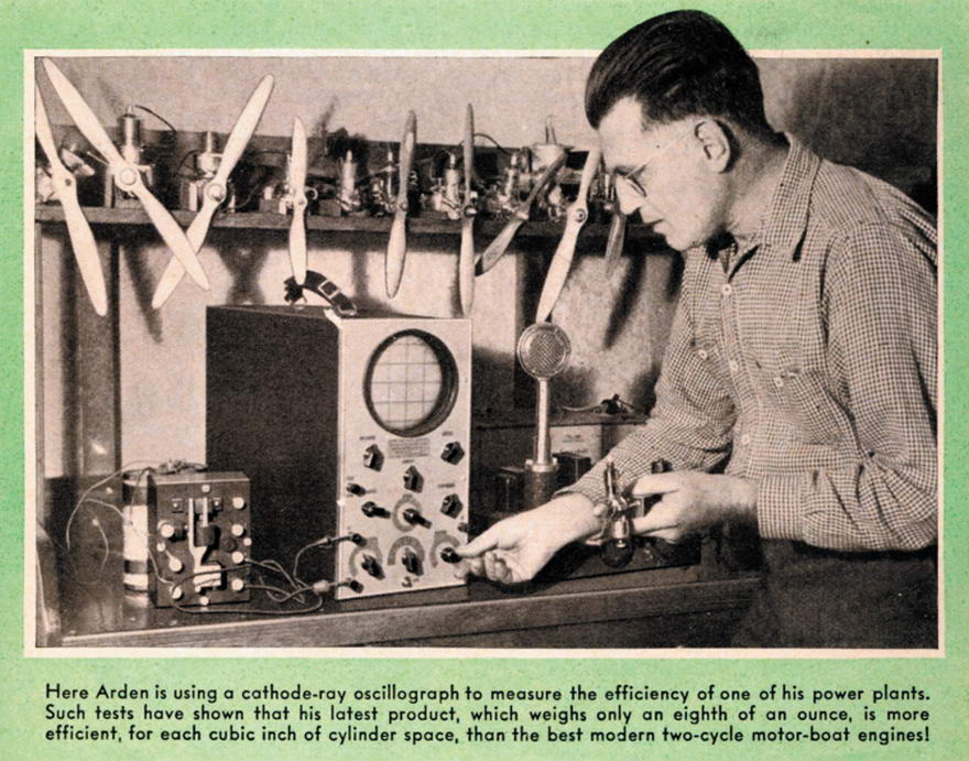 In Do You Speak Model Airplane?, author Dave Thornburg asks what are the most important advances in post-war modeling, and puts forward Ray Arden's Glow-plug, GE's cheap transistors, and Top Flite's Monocote as the answers. You may argue about the last two, but the Glow Plug must rank first somewhere in anyone's list. Today, Ray Arden is acknowledged as the Father of the Glow Plug, and well remembered for his Mighty Atom .099, and post-war Arden .099 and .199 cuin engines. As such, it should be no surprise that several biographical web pages already exist. It's rather senseless for Model Engine News to regurgitate their content, so please follow the links below to two comprehensive overviews of Ray Arden's achievements and contributions to model engine history.