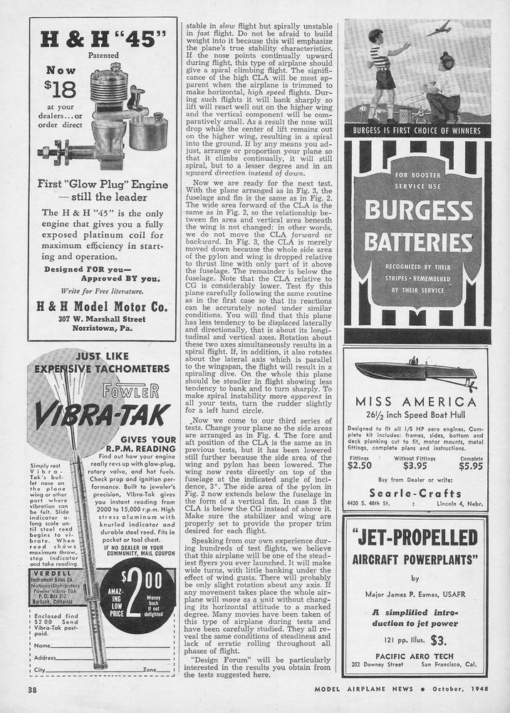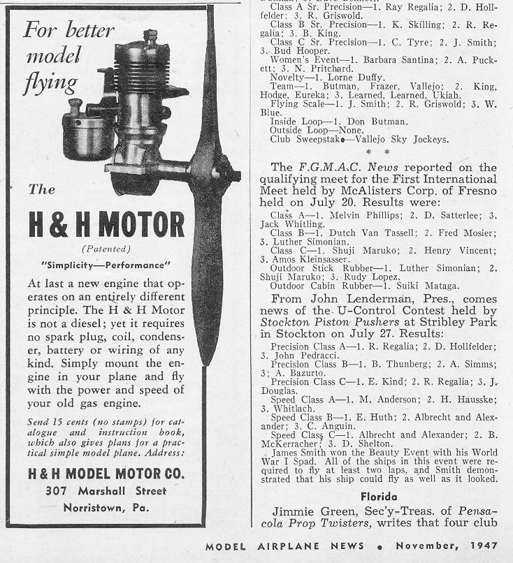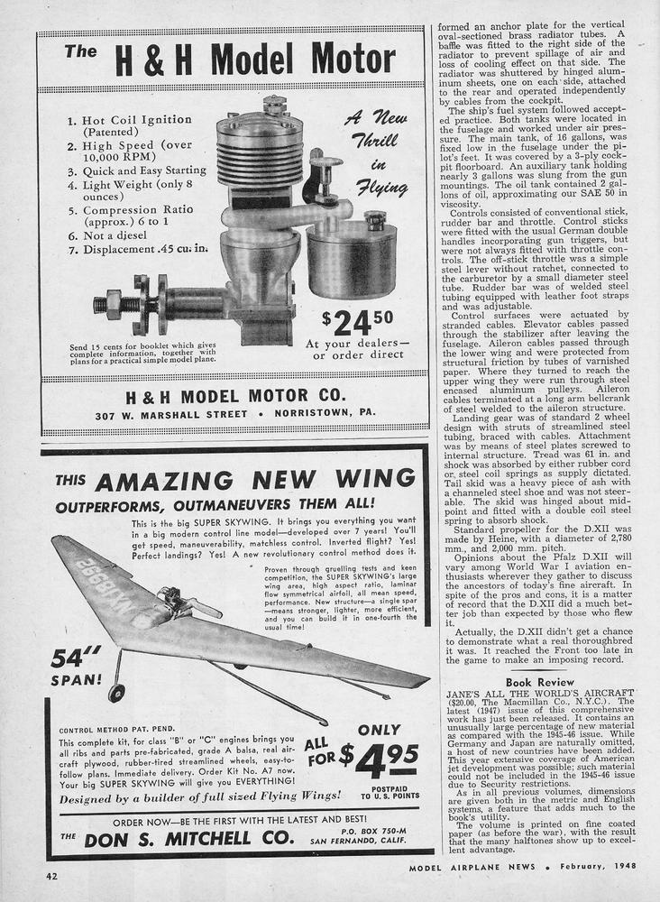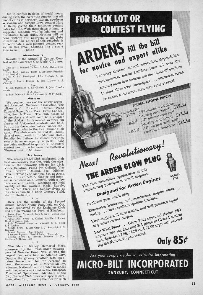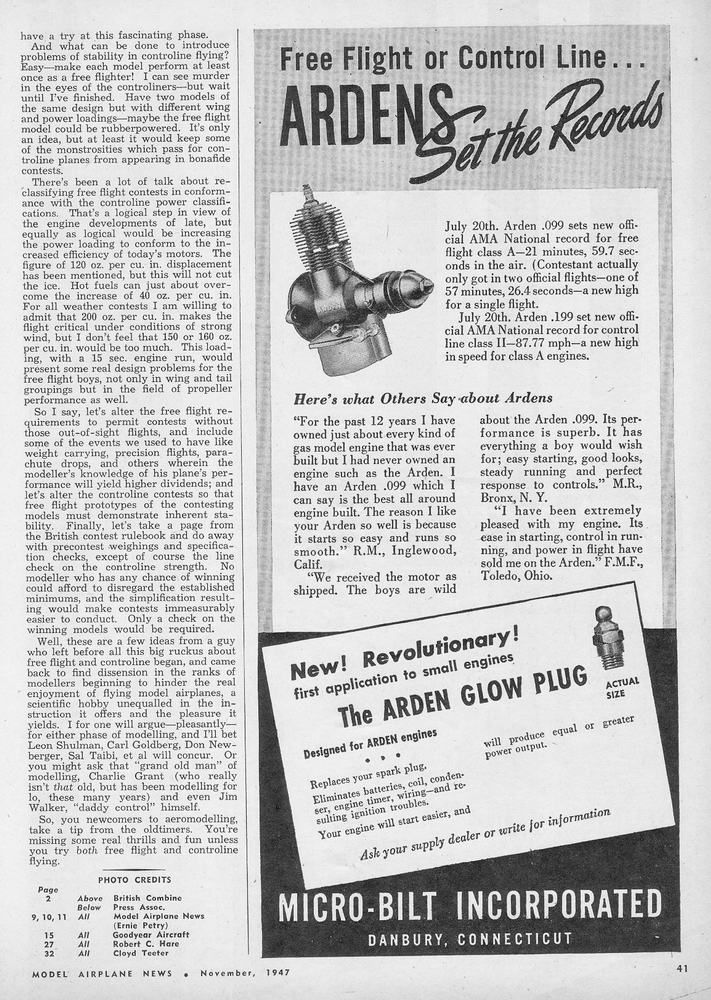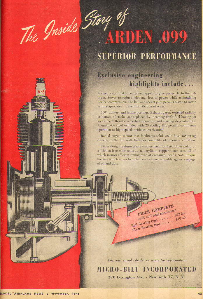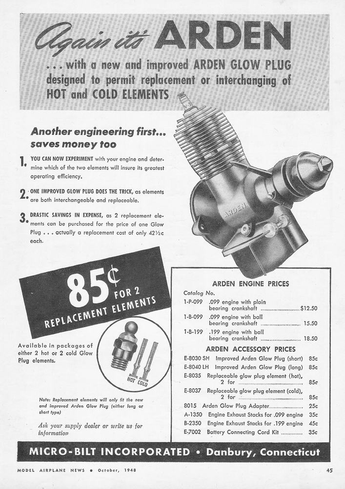 Once he had his plug working, it seems Arden wasted no time. The first announcement of the Arden Glow-Plug in Model Airplane News (MAN) appeared in the November, 1947 issue, inviting modelers to "ask their dealer", perhaps buying a bit of time. In the same issue (p47), H&H had an ad for their patented hot-coil ignition engine (though it was not yet called that). Their text is a bit misleading: ...requires no spark plug, coil, condenser, battery or wiring of any kind. Simply mount the engine in your plane and fly...", but then, Arden's claims in the same issue were not all that different.