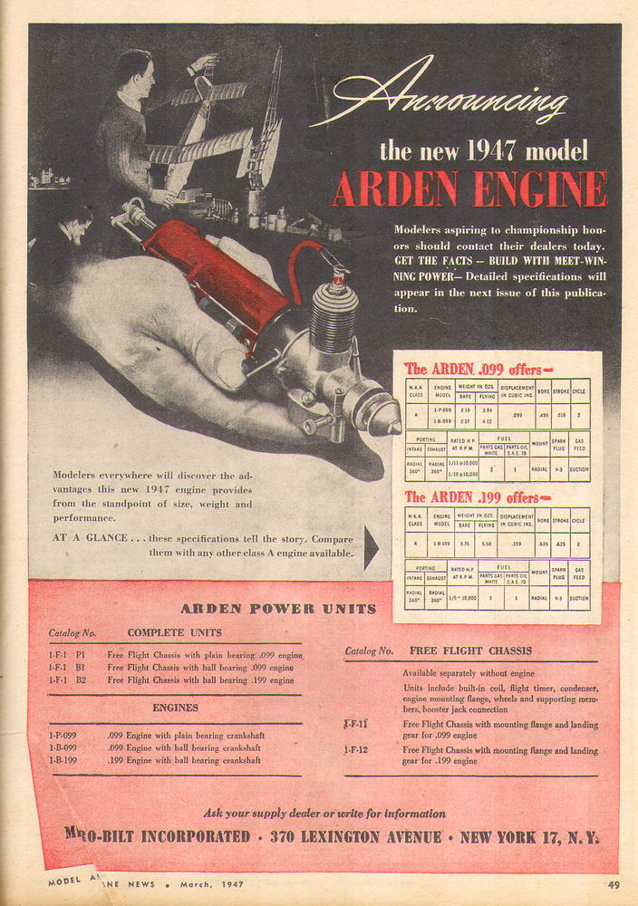 As we leave Ray's engines, have a look the Arden advertisement from MAN of March, 1947 (right) for Arden's Flight Chassis, which was available with and without engine. Now compare this with his 1948 Patent 2557626. The Flight Chassis contained all the ignition paraphernalia, an ignition cut-out timer, and even the landing gear. The result was a fully self-contained, easily interchangable power egg. It looks like his 1948 patent was heading in the same direction, except it did not need any ignition components, and had to stop the (glow) engine by killing primary compression and so (hopefully) stopping fuel suction, eventually. It did not go into production—cutting off the fuel supply was far simpler.