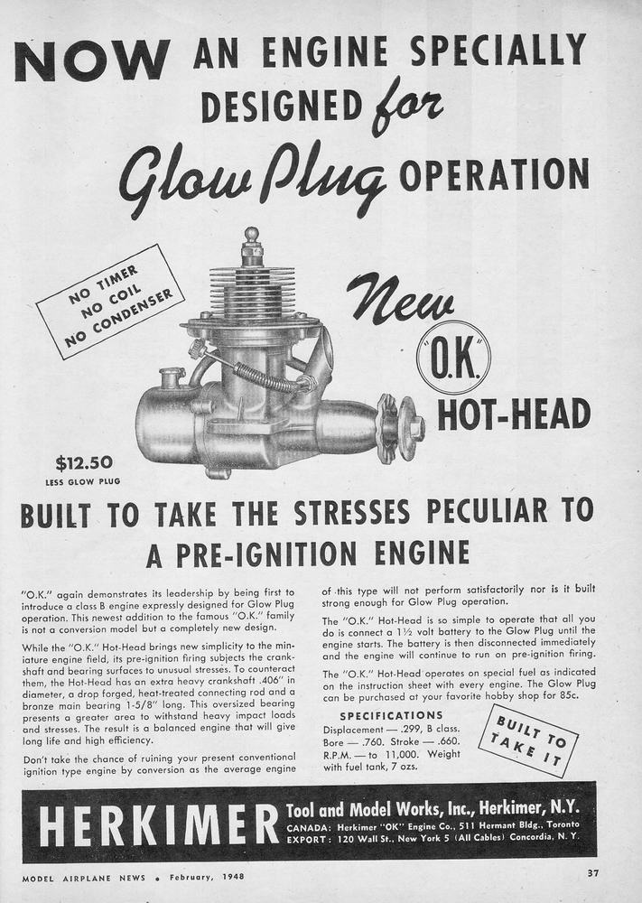 By the January 1948 issue of MAN, things had hotted up, if you'll excuse the pun. Arden now advertised a price (85c each) and had some early adopters had contest wins at record breaking U-control speeds under their belts. H&H seem to have recognized they were in a battle as their ad was larger and now used the term "Hot Coil Ignition" (p42). But on page 37, OK printed the death notice for H&H's hot-coil with a full page announcement for the first engine specially designed for the Glow Plug; the "new OK Hot Head" (cute). This was really an OK "Super 29" with the timer section of the crankcase nose covered by a fairing. The text is more honest, explaining the need for a starting battery, the need for a "special fuel", and a claim, which may even have been truthful, that the internals had been beefed up to take the stresses of pre-ignition (higher compression ratio would be more like it).